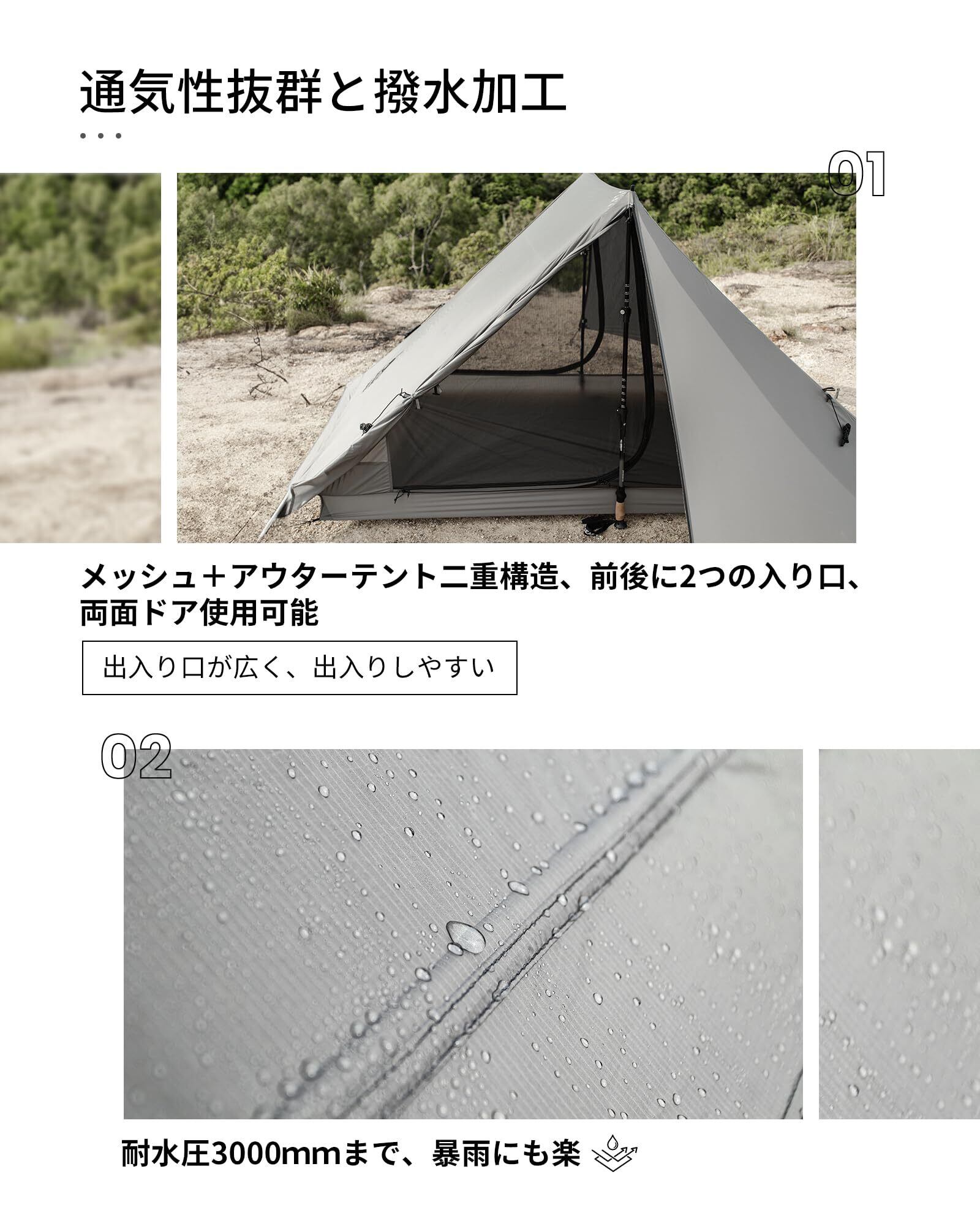 【通気アップ・結露対策】オリジナルデザイン、通気性の良いテント!暑い気候で最大限の風通しを確保するために、アウターの扉は特定のウィビングとジッパーで半密閉式のフロントベンチレーションを作ります。左右のサイドボトムにはオープンベンチレーションメッシュが設計され、空気の対流を促進し、結露を軽減でき、より安らかな眠りを提供します