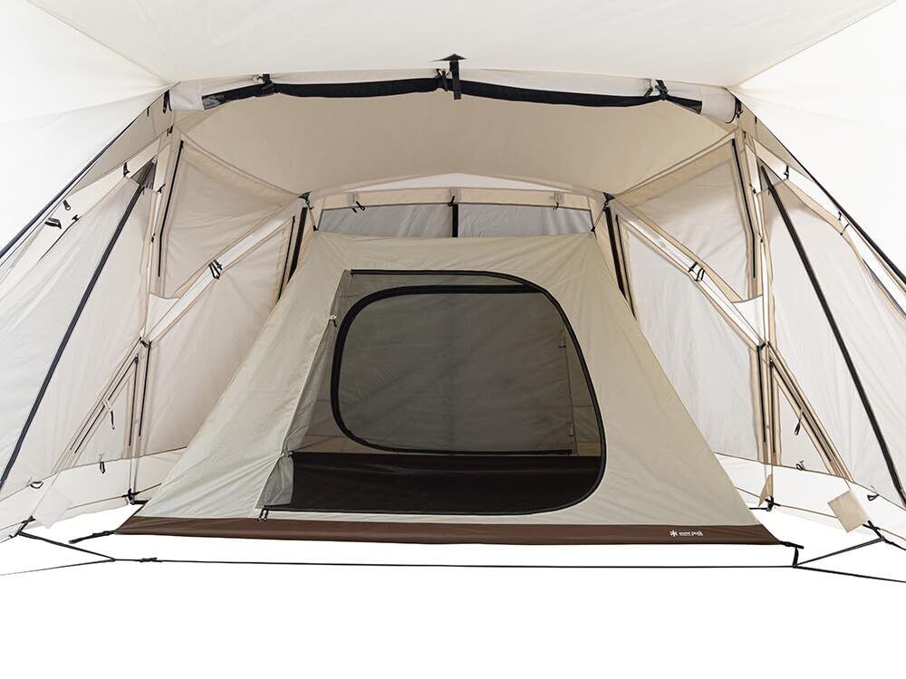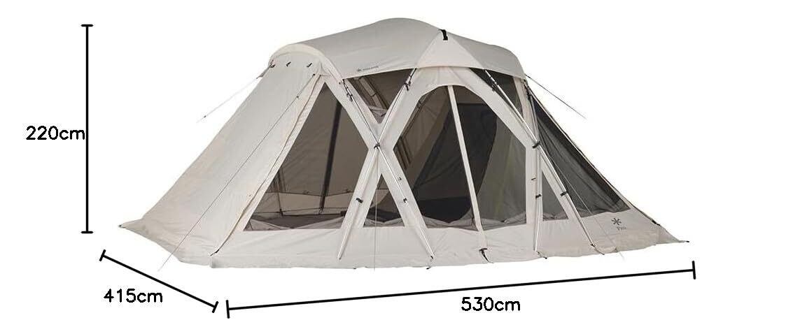 材質:本体/210Dポリエステルリップストップ・PUコーティング耐水圧1,800mmミニマム・撥水加工・UV カット加工(ルーフ部、ウォール部)、210Dポリエステルリップストップ・PUコーティング耐水圧450mmミニマム(スカート部)、ルーフシート/210Dポリエステルリップストップ・PUコーティング耐水圧1,800mmミニマム・撥水加工・UVカット加工、インナールーム/68Dポリエステルリップストップ(ウォール部)、68Dポリエステルリップストップ・PUコーティング耐水圧450mmミニマム(ドアパネル部)、300Dポリエステルオックス・PUコーティング耐水圧10,000mmミニマム(ボトム部)、グランドシート/210Dポリエステルオックス・PUコーティング耐水圧1,800mmミニマム、フレーム/A6061(Φ16mm、Φ19mm)