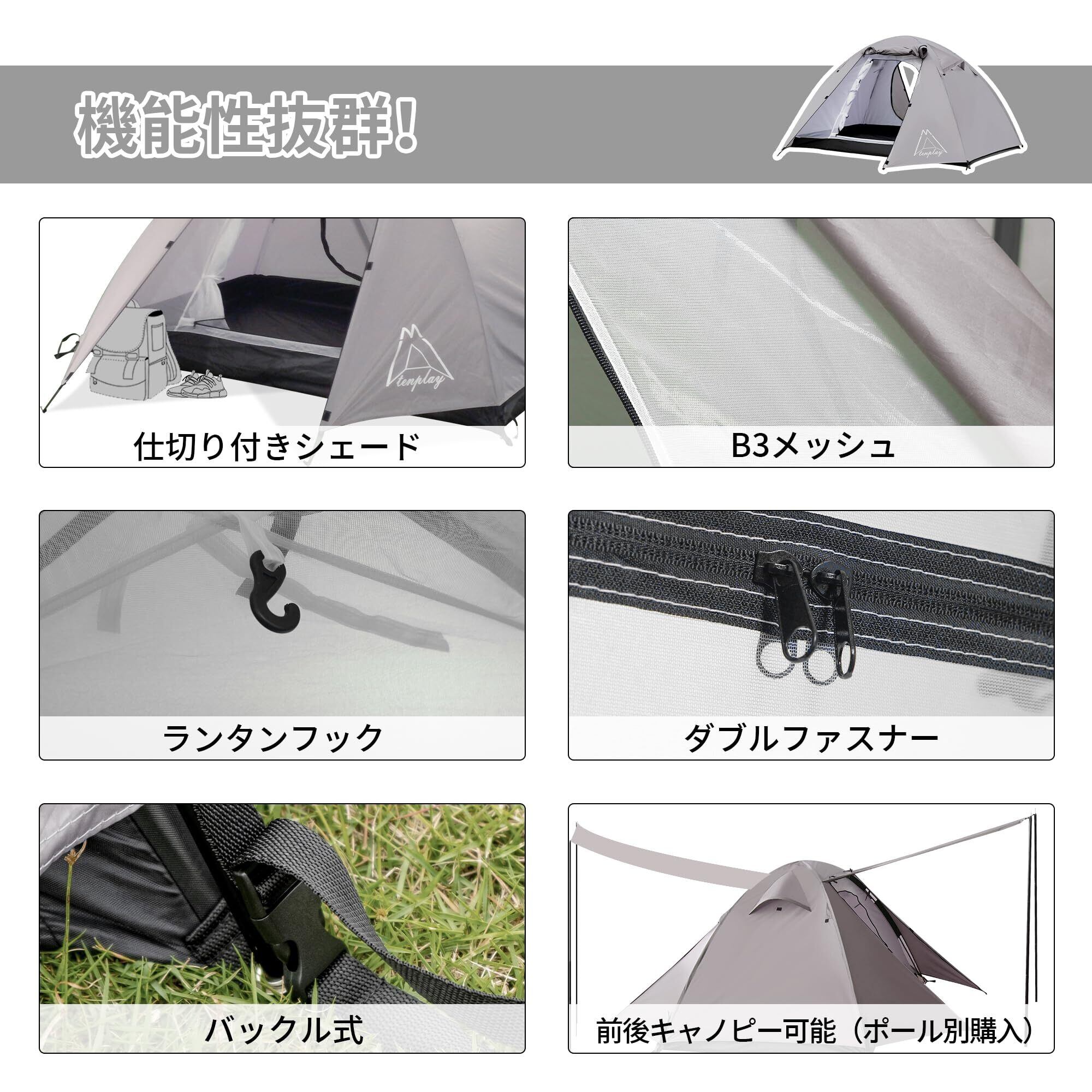 【デザイン・機能性】ドア2つ、前室2つ、キャノピー2つ。両側に荷物や靴を置くための幅60mのスペースがある、前室のフライシートをトレッキングポールや木等の棒状の物を使って簡易的なタープのような快適な空間を作ることができる。キャリーバッグが付きで、どこでも持ち運び便利です。