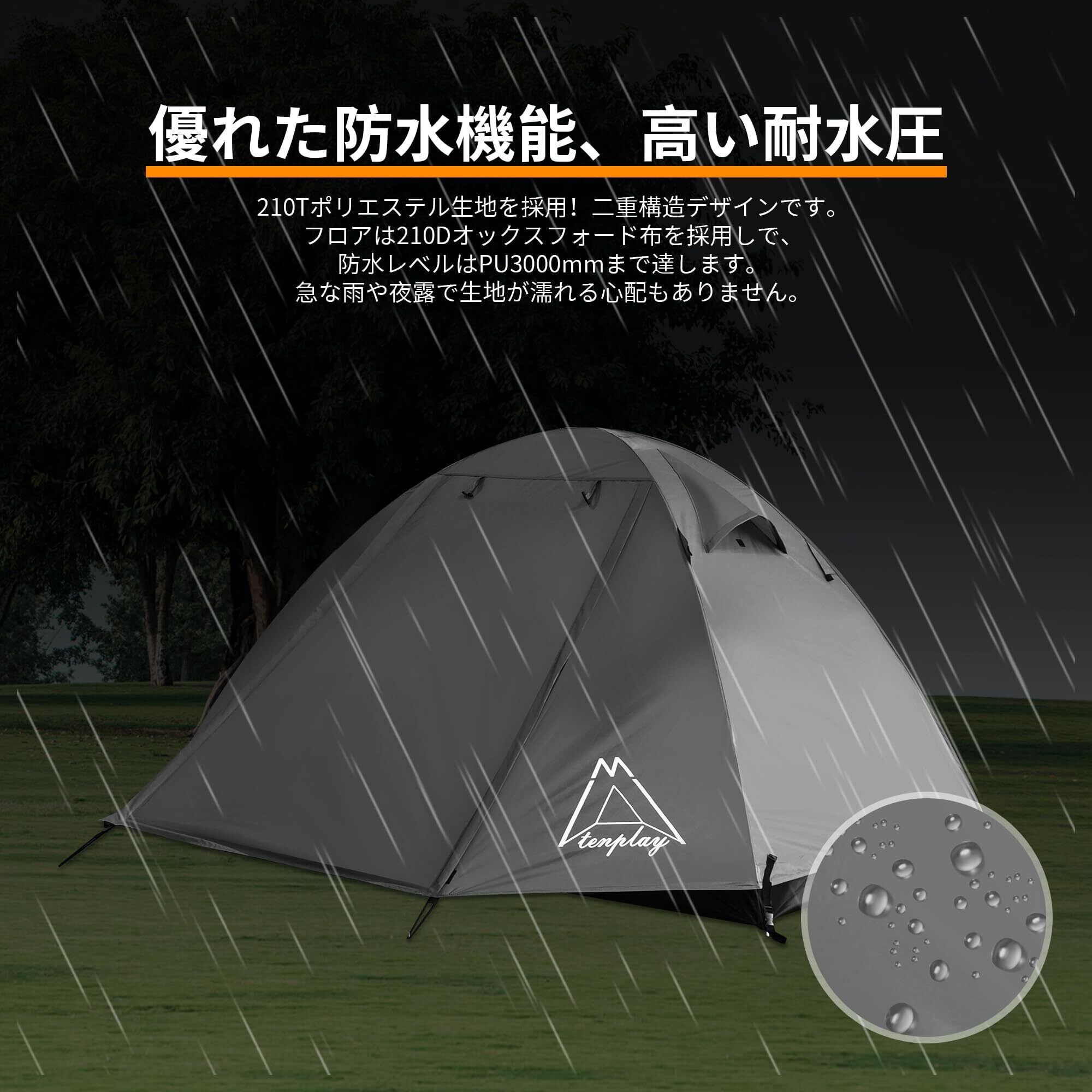 Tenplay ドームテント 2人用 山岳テント ソロキャンプ ツーリング 二重層構造 1-2人用 アルミ製ポール 軽量 耐水圧3000mm 自立式 4シーズン 防災用 前後ドア 前室 ダブルウォール ベンチレーション通気 防風 防水 アウトドア コンパクト 簡単設営 蚊帳 メッシュ インナーテント 虫よけ簡易テント 初心者向け キャンプ 登山 バックカントリー ピクニック 収納バッグ付き
