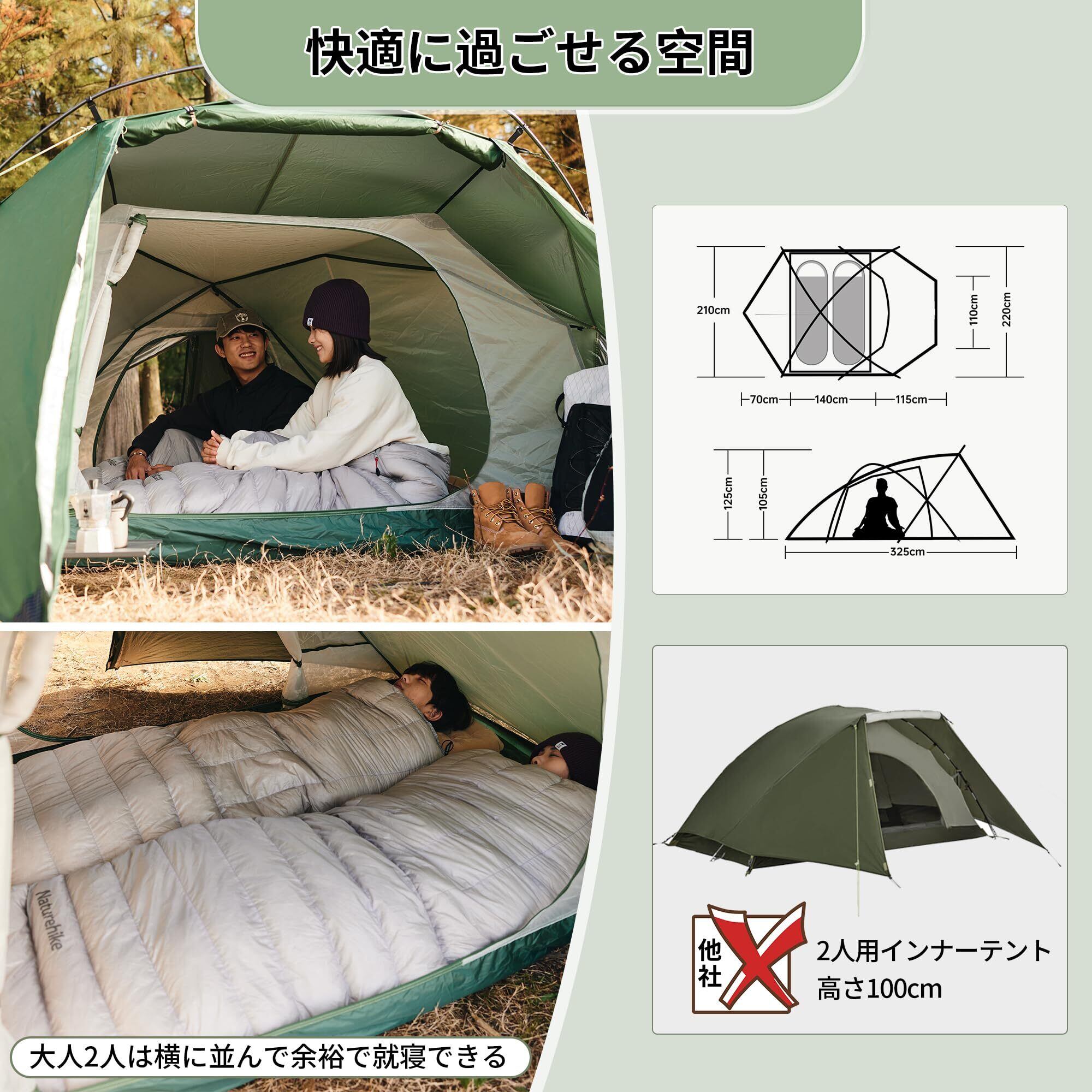 Naturehike直営店 テント 2人用 自立式 広い前室付き 軽量 ダブルウォール アウトドア 耐水圧2000㎜ 防風 収納袋付き コンパクト 3シーズン 防災用 キャンピング ソロキャンプ