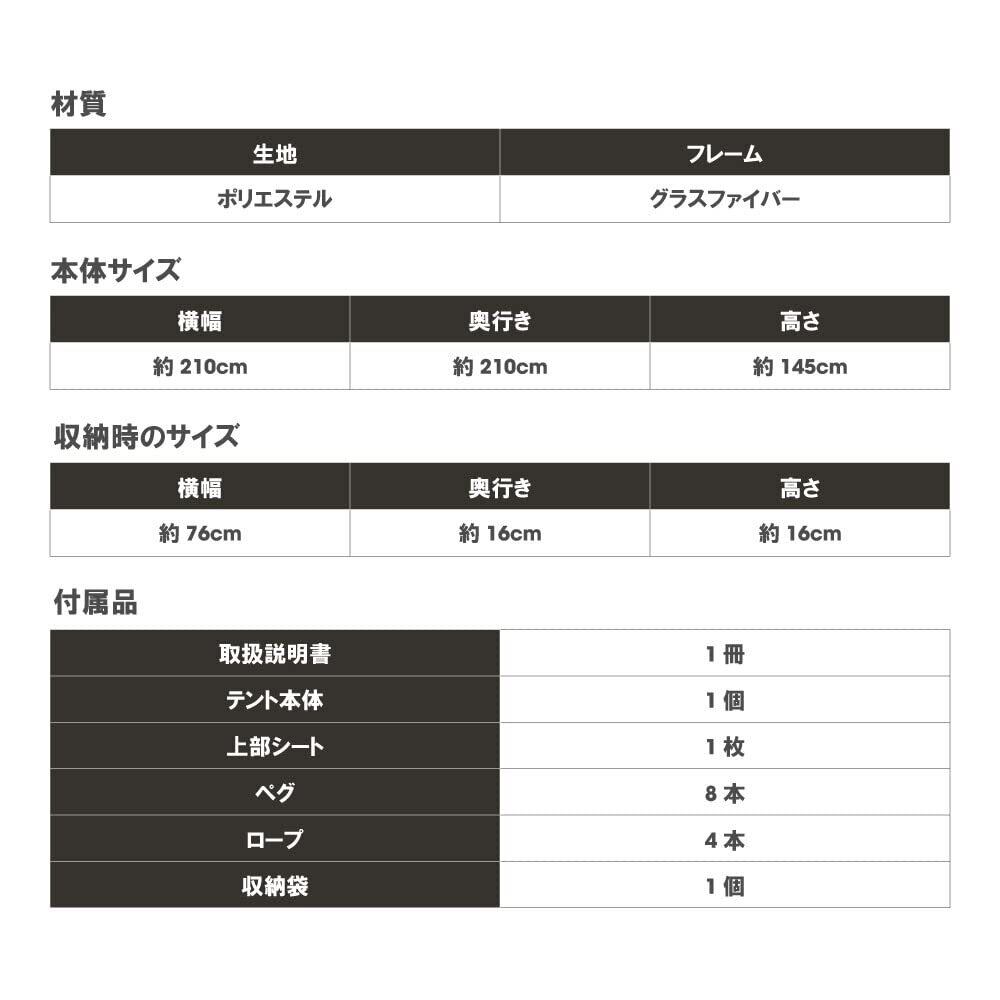【製品仕様】材質:ポリエステル(オックスフォード織)、グラスファイバー(フレーム) / サイズ:組立時 約W210×H145×D210㎝ 収納時 約W76ר16㎝ /重量:約3.2kg / 付属品:収納キャリーバッグ(ポリエステル製)/ 日 本語取扱説明書付き