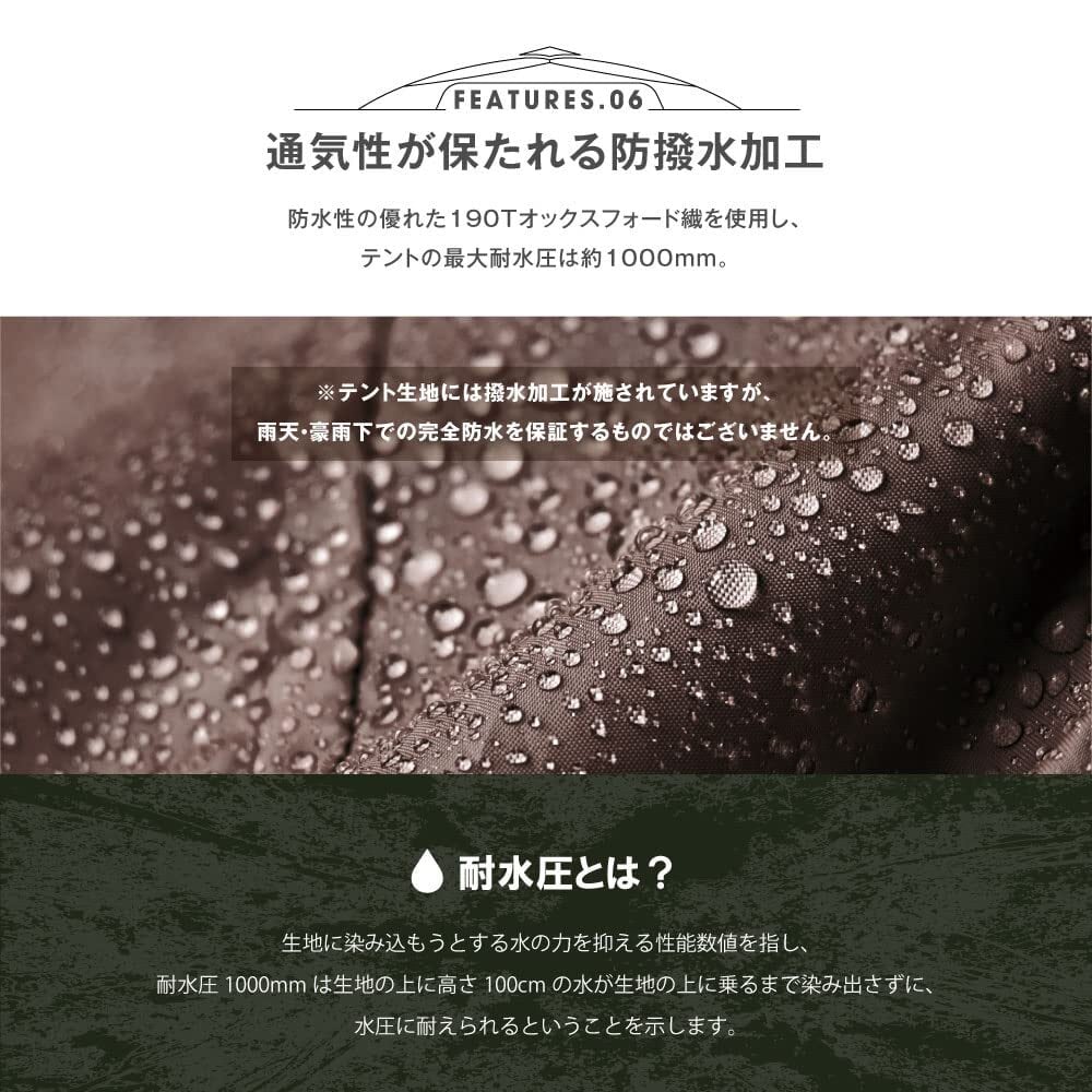 【オックスフォード織 / 耐久性 耐熱性 防水性】テントシート素材はポリエスレルのオックスフォード織。柔らかい手触りと強度があります。オックスフォード織は気孔が多く、厚地ですが通気性に富んでいて夏場には最適です。さらにシート裏面にはdシルバーコーティングが施され、遮熱性、遮光性に優れ、dカットは世界基準UPF50+の最大99%カット値を認証されています。また、テントをフライシートが覆う二重構造、耐水圧1,000㎜の高い防水性など荒天に配慮された安心なテントです。