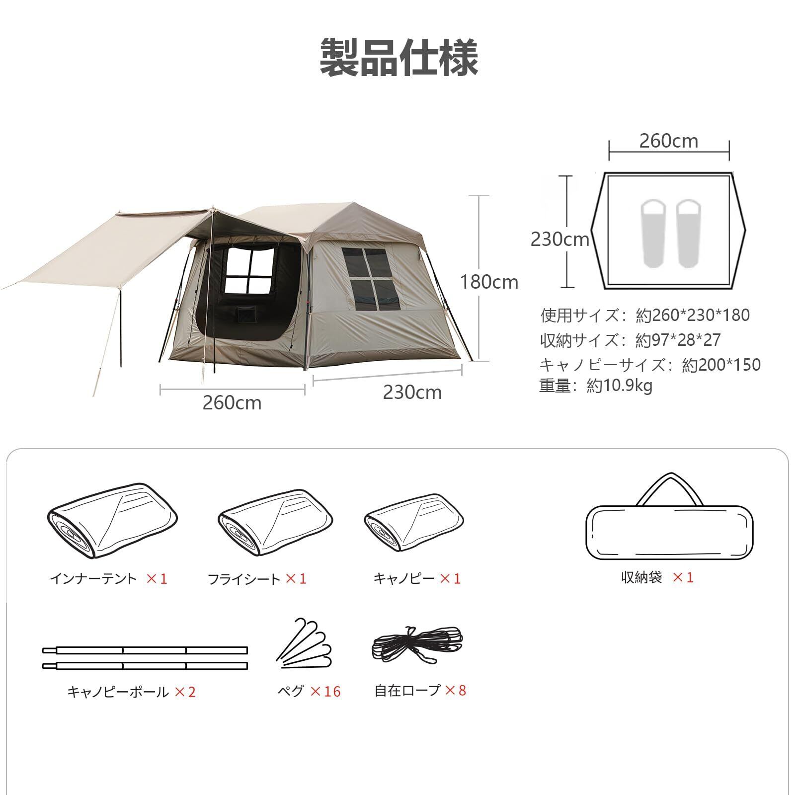 【2〜4に対応できる大空間】2〜4人用テント。展開サイズ:260*230*180cm、キャノピーサイズ:200*150cm 収納サイズ:97*27*27cm 、重量:約10.9kg 、フロア面積:約5.98㎡(4畳)。登山、キャンプ、ピクニック、テント音楽祭、スポーツイベント、ツアー、秋の行楽、春の行楽、釣り、お花見などに適しています。災害時の防災用品としても使えます。