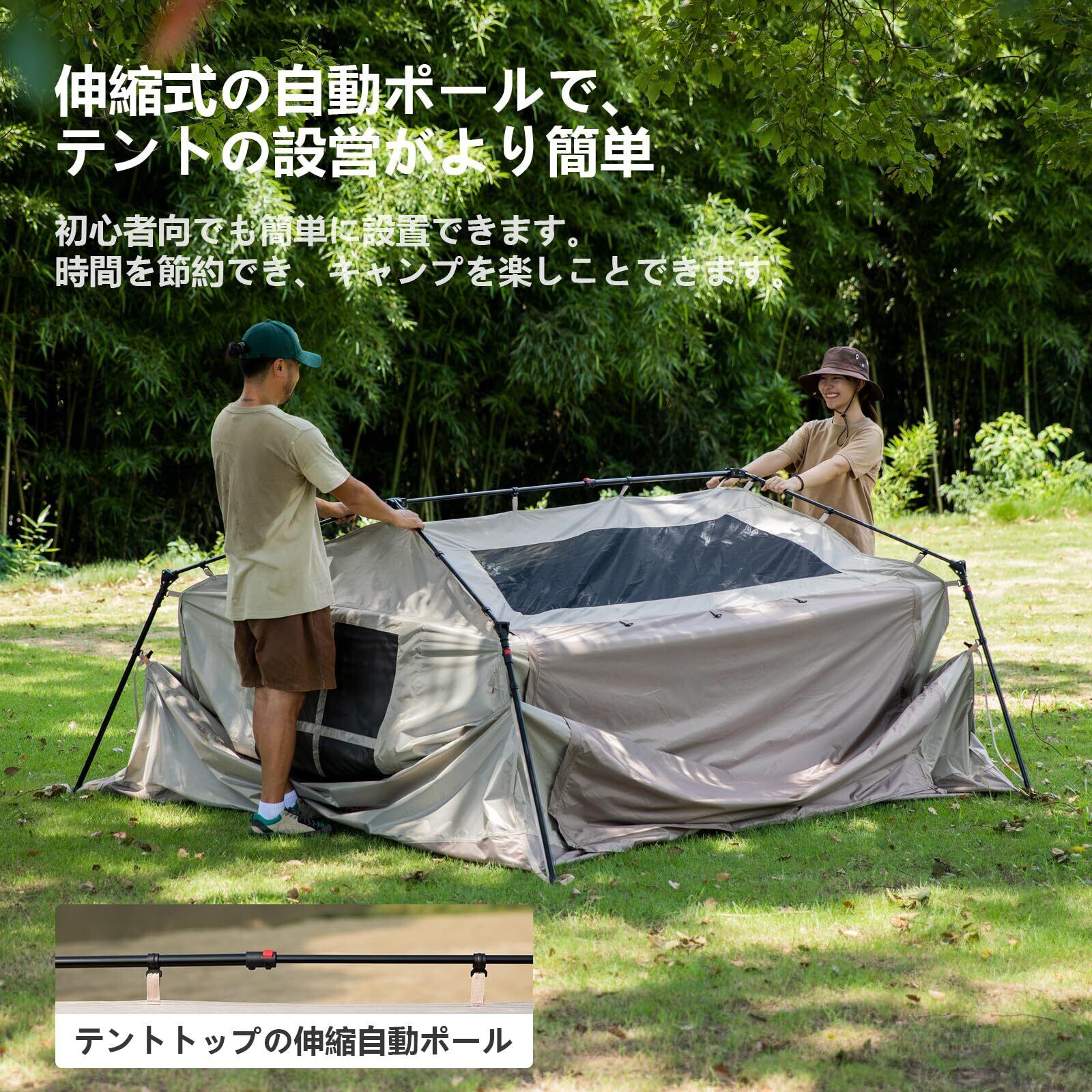 【高強度な材質・防水通気】フライシートには150Dのチタンコート・オックスフォードファブリックを使用して、UV50+、有効的に紫外線防止でき、遮熱性も高いです。耐水圧がpu3000mm、雨の日でも安心で眠れる、二重構造であるためテント内に湿気を防止、雨天や低気温時に結露しにくいです。複数のメッシュ付き二層構造の窓とドアパネルが配置されており、風通しが良し、ご好みや使用状況に応じて自由に開閉できます。