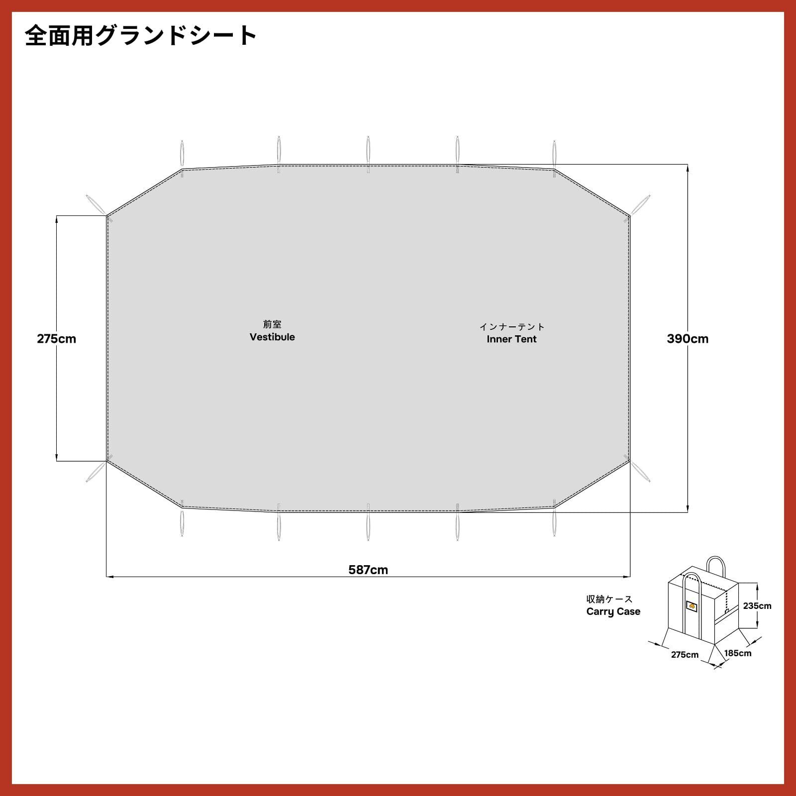 【2 つのサイズをご用意 】【インナーテント用グランドシート】インナーテント部分を覆う。 【全面用グランドシート】インナーテント用と前室部分を覆える特殊形状となっており、荷物を置きとしても便利な形状です。
