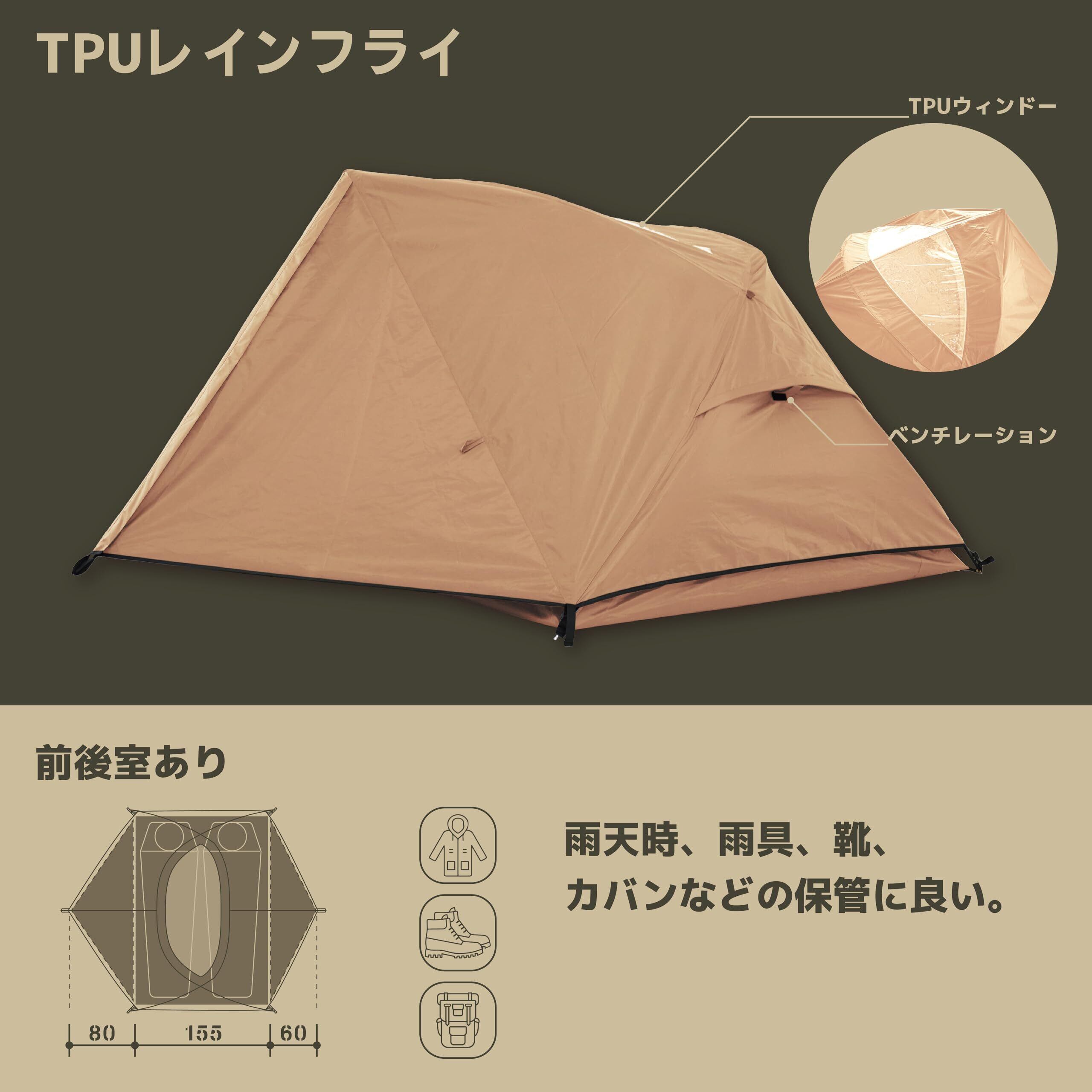 【通気性の良いコットン製テント】TCコットン生地を使用した高級キャンプテントは、耐久性と通気性に優れ、結露を軽減することで快適な睡眠環境を実現します。CAMVILの2人用テントは簡単に設置可能で、フルレインフライとグランドシート(フットプリント)を標準装備しています。