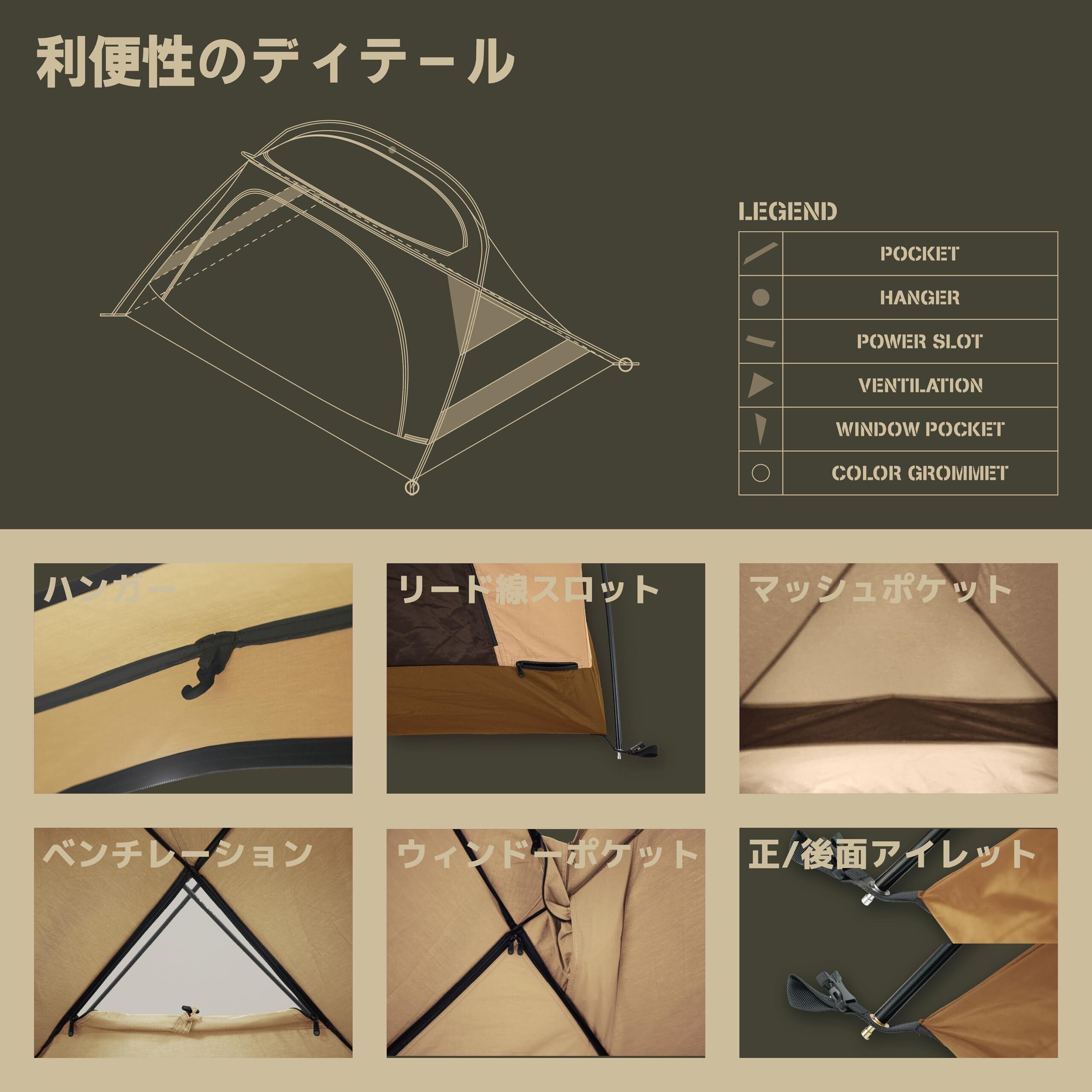 【高級感あるドーム型デザイン】巻貝をモチーフにしたユニークな形状が特徴で、フック・電気アクセスポイント・収納バッグを完備。インナーテントのドアと窓は全てメッシュ+キャンバスの二重構造。レインフライ上部にはTPU製透明スカイライトを採用しています。