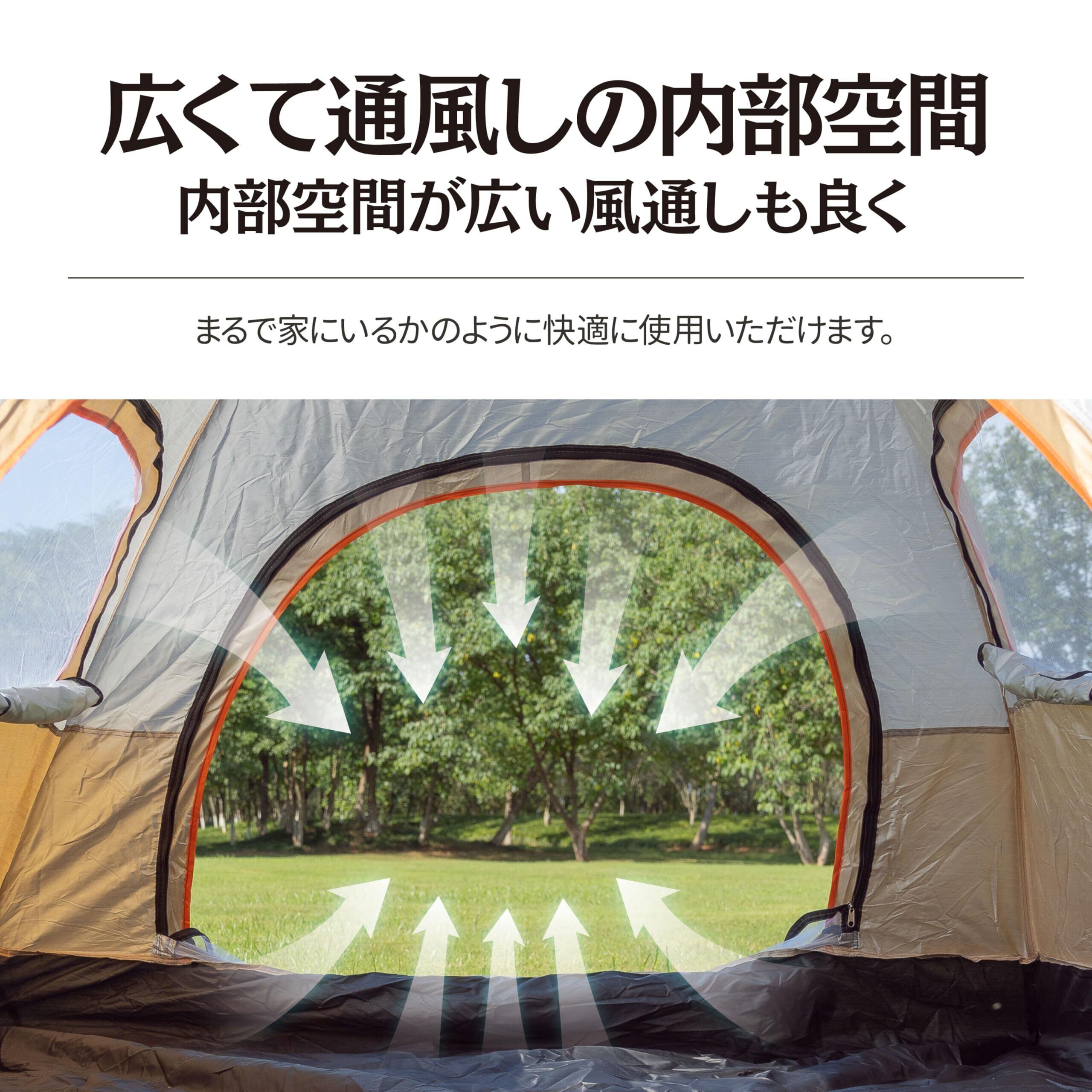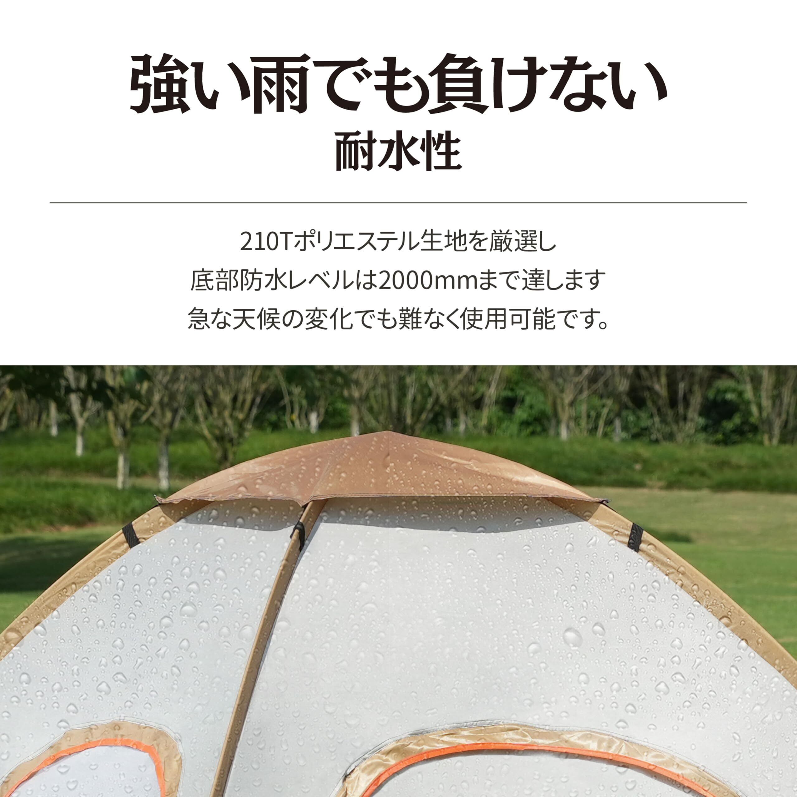 【UVカット・防風防水・耐久性抜群】️強い陽射しの日でもUVカット加工で真夏の強い紫外線をしっかりカットします。210Tポリエステル生地を厳選し、フライシート防水は1500mm、底部防水レベルは2000mmまで達します。(インナー)180Tポリエステルと高密メッシュを採用し、また、テントポールには高強度ガラス繊維を採用し、可調節絞り編み張り縄と合わせてテントをしっかり固定していただくことで、耐風性能と安定性を確保できます。