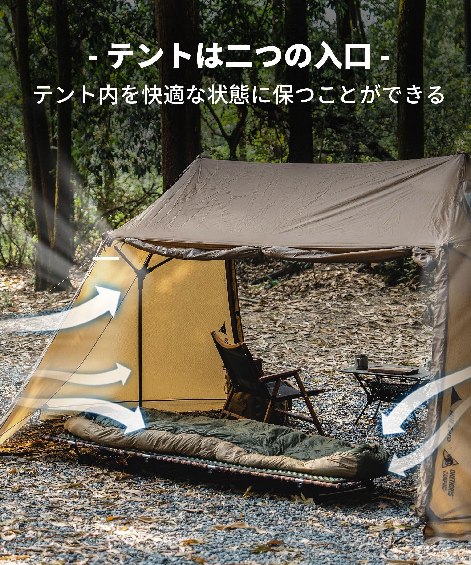 前後室付きパップテント:2つの入り口がある独特の6面六角形デザイン、ドアはすべて開いて出入りできます。復古風軍幕での視覚効果UP、テントポールを使用してキャノピーとしてスペースを有効活用できます。 ソロキャンプから家族キャンプに最適なテント前後室を広く使用することができます。この1台でゆったりキャンプを楽しめる初心者にも適したテントです。 テント内室両側には荷物や靴を置く場としてとても便利です。雨が降っても十分な安心感が得られます。