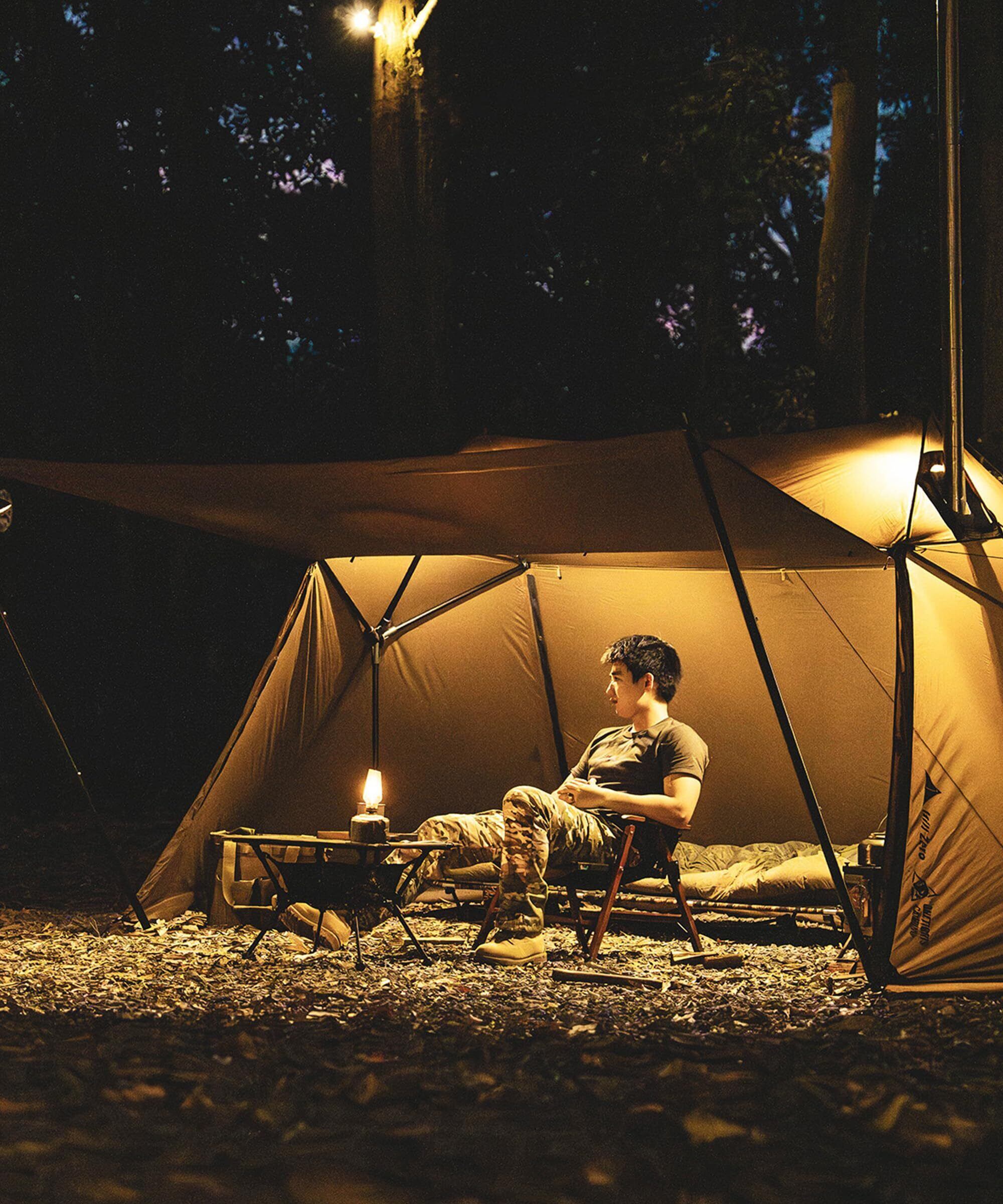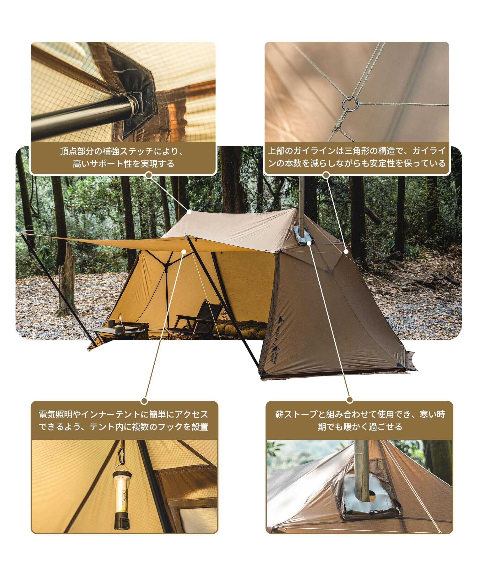 ONETIGRISとHILL ZEROブランドの連名による革新的なデザイン:SOLO HOMESTEADよりもシンプルで、おじぎ型の三叉戟ポールが採用され、内部の活動スペースが増加し、より安定性が向上しています。 また、ロープの数を減らしましたが、安定性や耐風性には全く影響を与えず、設置がより便利になりました。