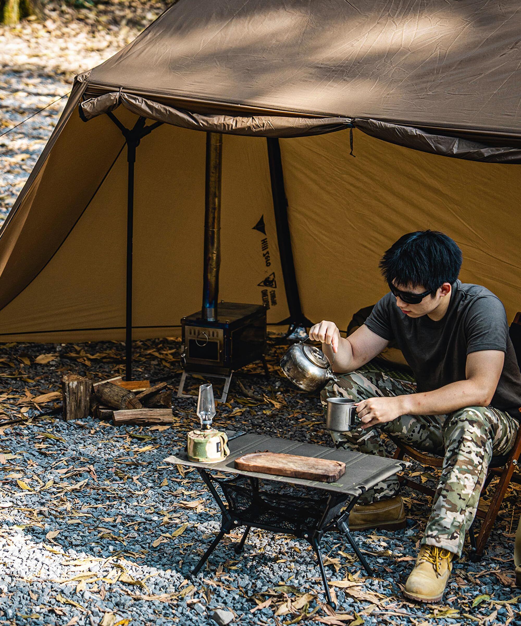 広々とした内部空間のテント: このテントは古典的なパン屋のテントに似ています。パン屋スタイルのテントは、睡眠エリアと広々とした玄関エリアを備えた古典的なテント設定です。 玄関エリアには床がなく、睡眠エリアの前に天然の座席と暖炉エリアがあります。このテントの内部使用スペースは260cm×260cm×175cmで、SOLO HOMESTEADよりも広く、側面には煙突口が配置されていて、秋冬の季節には快適な空間を提供します。 一人用には十分な広さで、2人用にもゆったり快適に使用できるサイズ設計、圧迫感をまったく感じさせません!