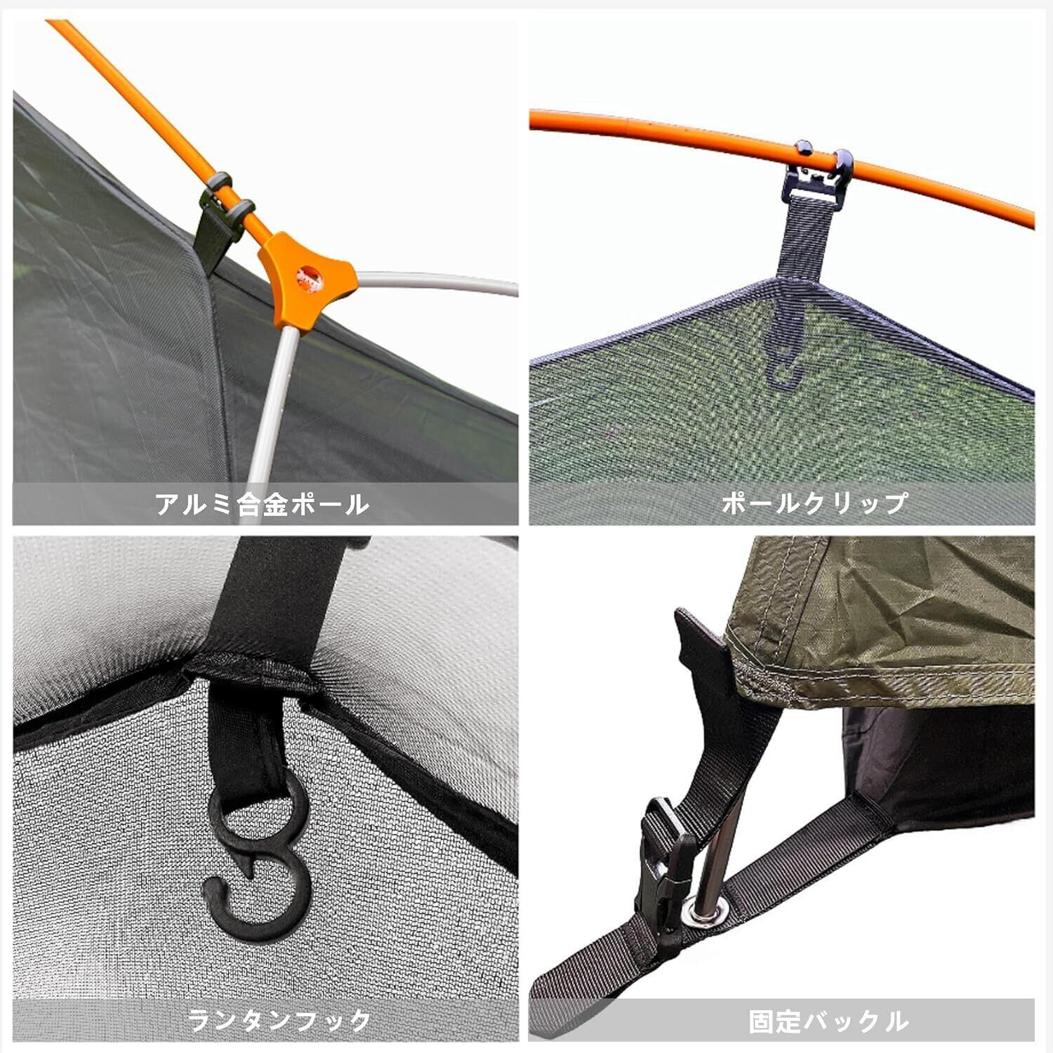【こだわり機能満載】 カーテンタッセル:タッセルで開いたドアを留めておくことができます。 ●ダブルファスナー:開閉用のフロントシート、インナーメッシュはダブルファスナーが付いていますので、内外両側から簡単に開け閉めができます。 ●ランタンフック:寝室部分にランタンフックがあり夜間のテントライフをより快適にします。またキャンプやツーリングの道具・装備を吊るすことも可能です。 ●インナーポケット:小物やライトなどキャンプやツーリングの道具・装備も収容することができます。軽量ながらも、ストレスなくキャンプを楽しませてくれる充実の装備です。