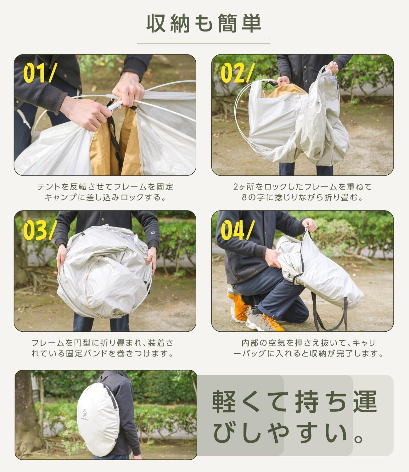 【持ち運びやすい&製品仕様】 製品名:ホップアップテント カラー:ブラウン。材質:ポリエステル(オックスフォード織)、グラスファイバー(フレーム) サイズ:組立時 約W200×H120×D150㎝ 。収納時は円形に折りたたむ収納式。約Ø60*t2.5㎝に収納。重量は約1.4kgの軽量タイプ。持ち運びやすいキャリーバッグが付いています。車に積み込みやすくトランクの荷物が多い時でも安心です。付属品:収納キャリーバッグ(ポリエステル製)