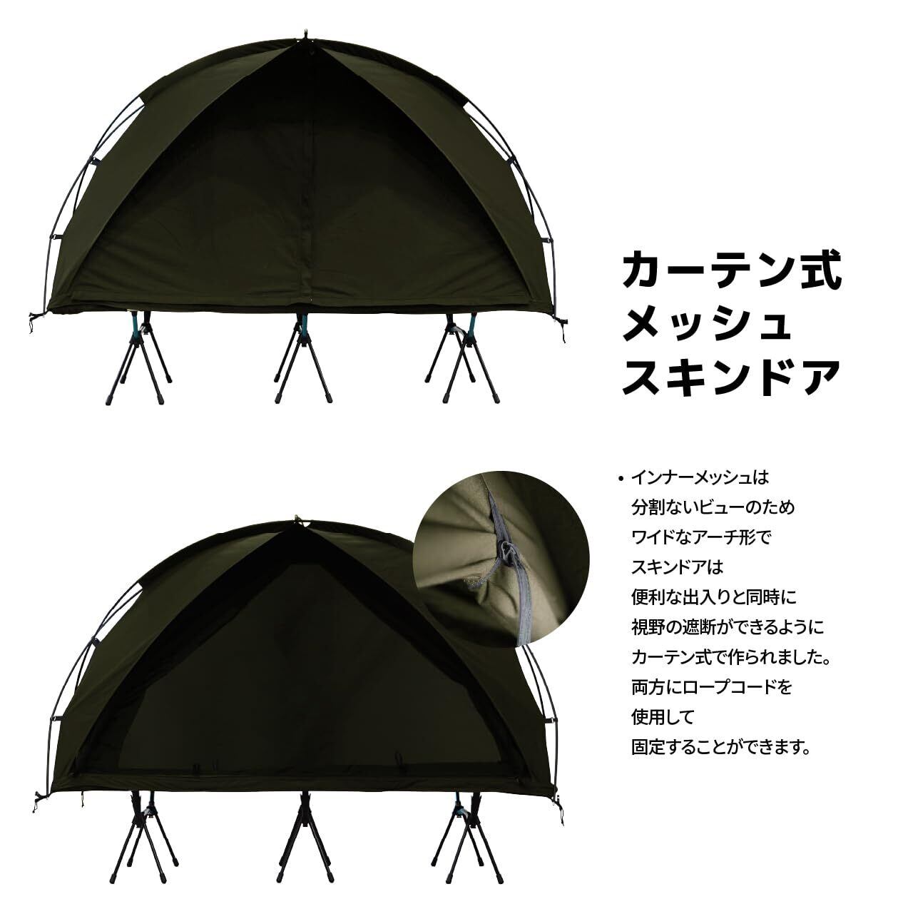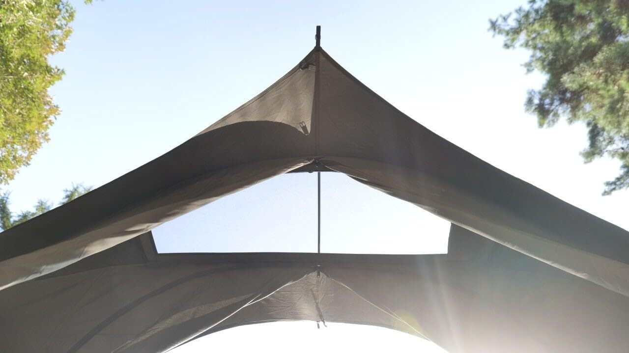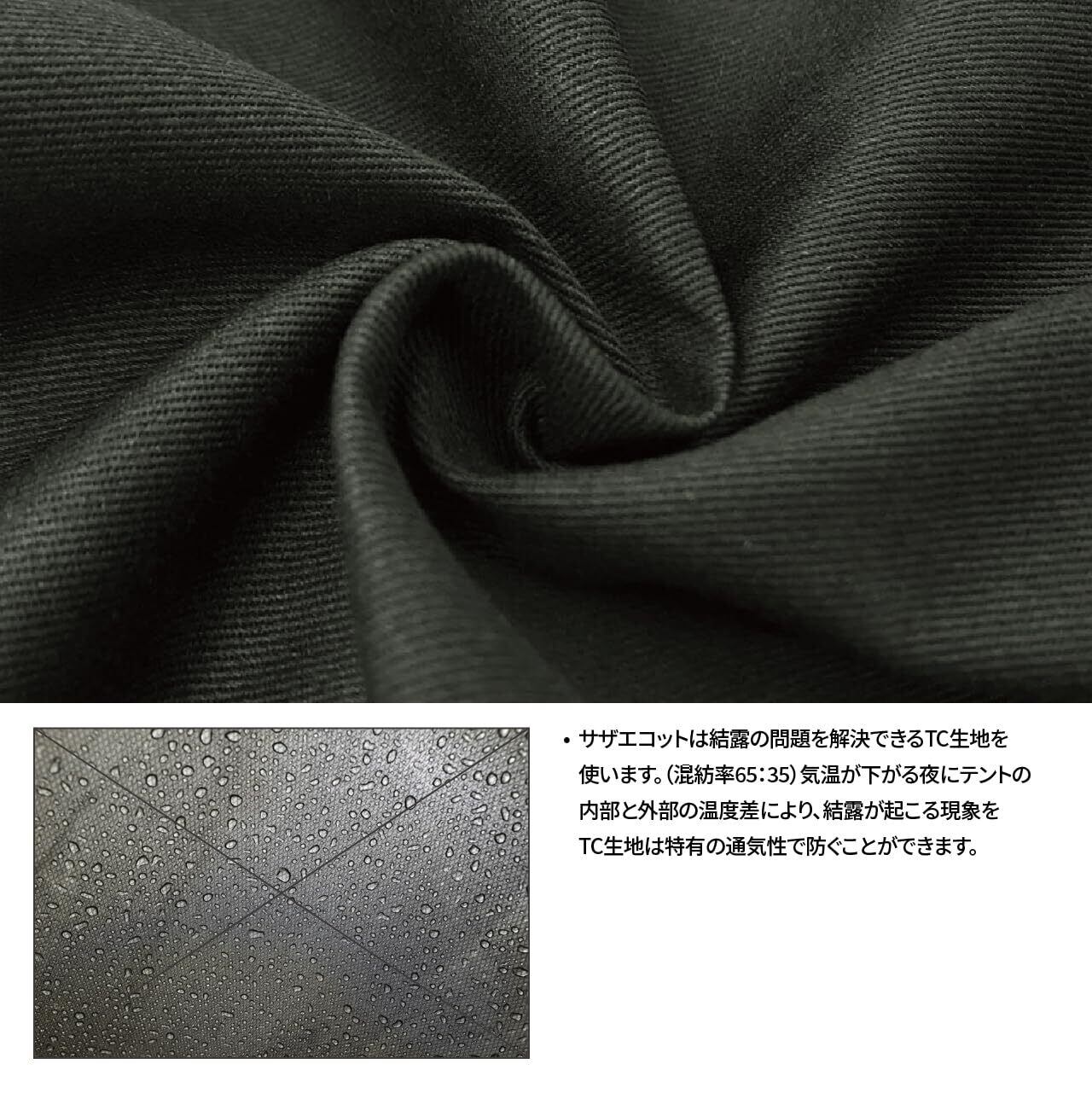 【素材特性】T/C混織生地採用:自立式テントには綿35%+ポリエステル65%のブレンド素材を採用。ポリエステル単体生地と比べ遮光性・通気性に優れ、綿配合によりキャンプ時の結露を最小限に抑えます。