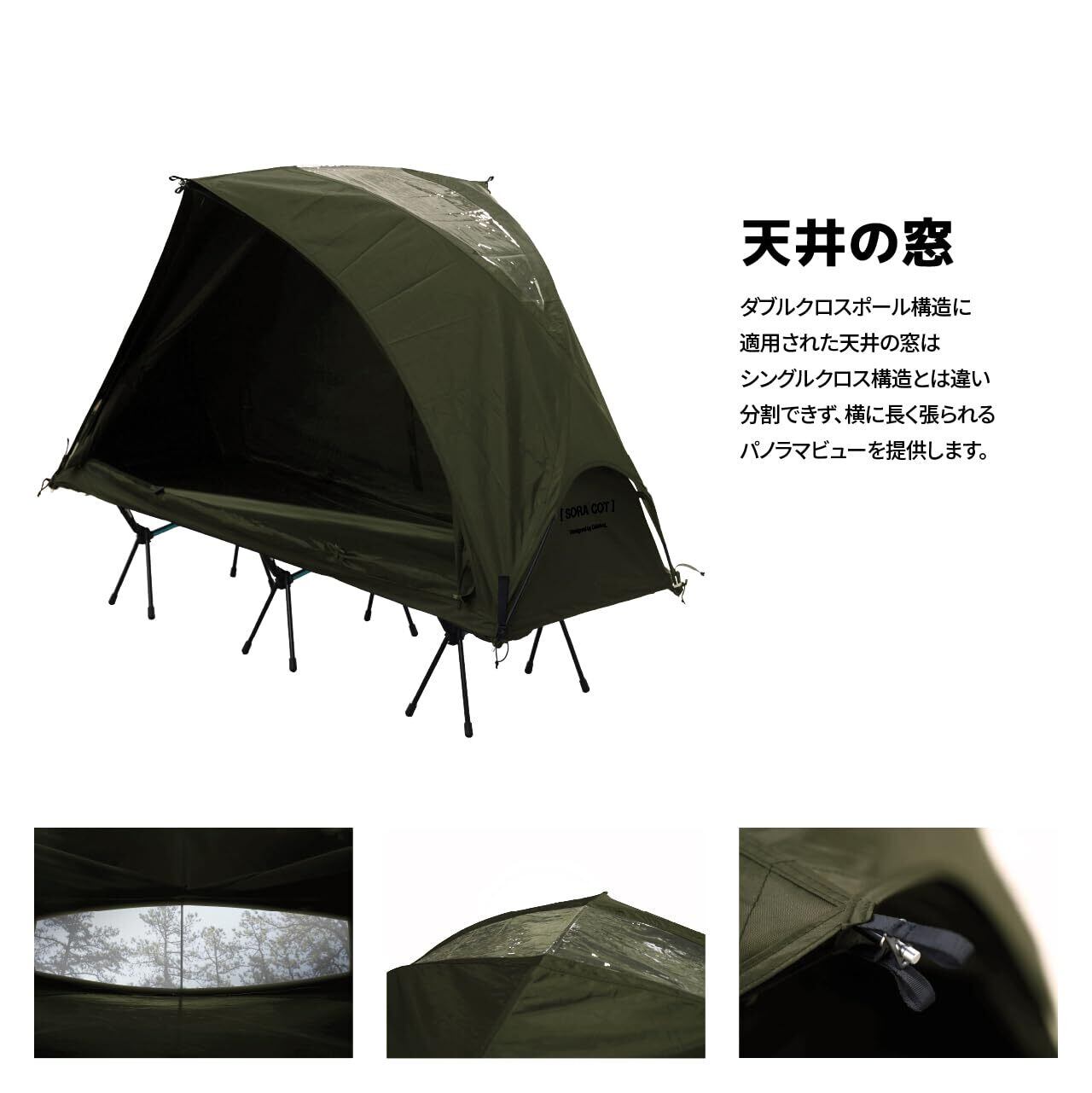 【TPU天窓&利便性】フライシートのトップにはTPUの透明な天窓がデザインされており、雨の日でも空を楽しむことができます。リード線スロット、ハンガー、マッシュポケットなど使用者のためのディテールが内部に設けられています。