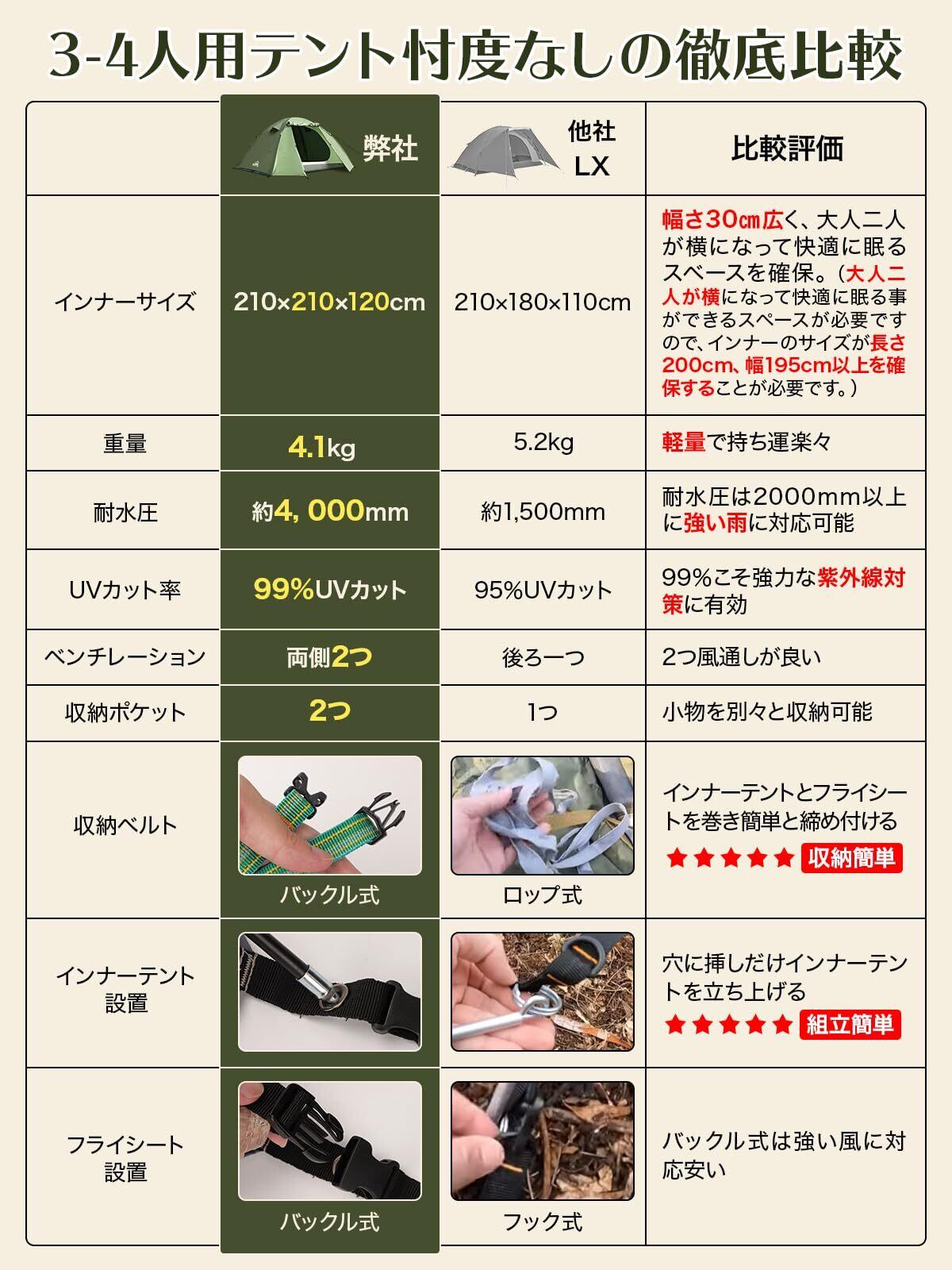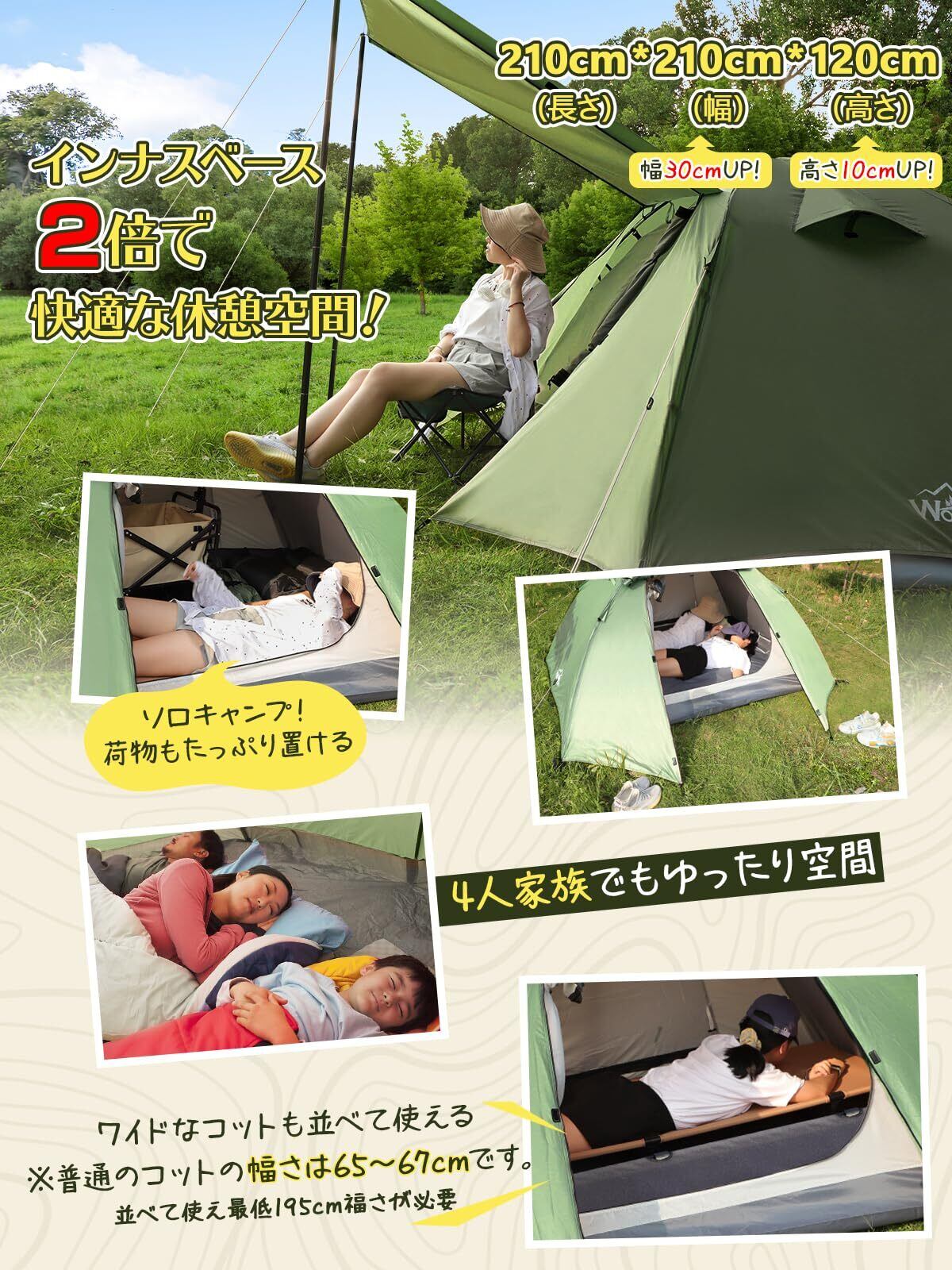 【商品仕様】定員:1~4人 インナーサイズ:210*210*120(cm)(特に幅さが50cm広がった) 材質:フライ+フロア/80D ポリエステルタフタ インナー/68D ポリエステルタフタ 収納サイズ:43*18*18cm セット重量:(約)4.1kg 商品パッケージ:インナーテント、フライシート、メインポール*2、ピグ*13、ロープ*4、キャリーバッグ 【こんなシーンで活躍 】キャンプ、ビーチ、海水浴、釣り、フィッシング、アウトドア、公園、BBQ、バーベキュー、ツーリング、海、山、川、ソロキャンプ、ファミリーキャンプ、グループキャンプ、グルキャン、ファミキャン、家キャン、おうちキャンプ