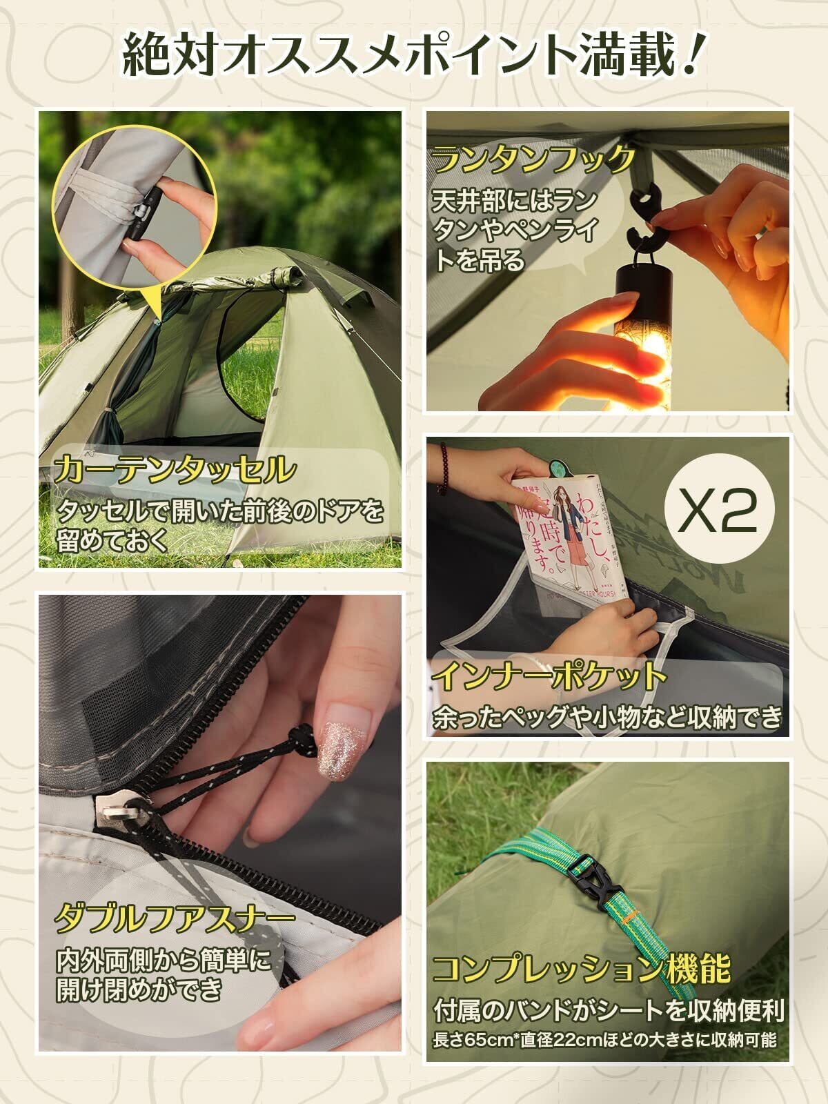 【こだわる機能満載】①カーテンタッセル:タッセルで開いたドアを留めておくことができます。 ②ダブルファスナー:開閉用のフロントシート、インナーメッシュはダブルファスナーが付いていますので、内外両側から簡単に開け閉めができます。 ③ランタンフック:寝室部分にランタンフックを配置して、夜間のテントライフをより快適にします。またキャンプやツーリングの細々とした道具・装備を吊るすことも可能です。 ④インナーポケット:小物やライトなどキャンプやツーリングの道具・装備も収容することができます。️【虫の侵入なし】インナーテントのメッシュの網目は、風通しを確保しつつも虫が入ってこられないちょうどよい細かさに設計されています。蚊帳としての役割も十二分に果たします。
