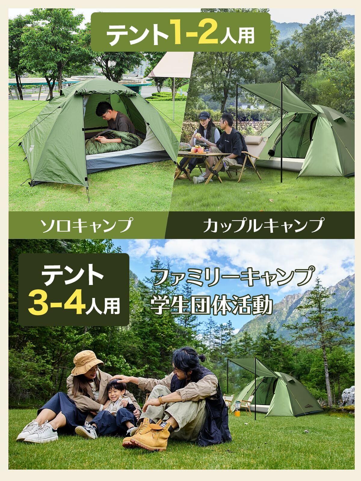 【在庫セール】テント 1-4人用 テント ファミリー 【最大肩幅が65cmの4人就寝】 4000mm耐水圧 広い前室 ソロキャンプテント コンパクト 大空間 撥水加工素材 開閉式ベンチ 二重層構造 4シーズン適用 wolfyok outdoors 簡単設営 軽量 UVカット 通気防風防雨防雪 アウトドア/登山/釣り/ピクニック/防災用/初心者キャンプ用品ギア【国内ブランド】