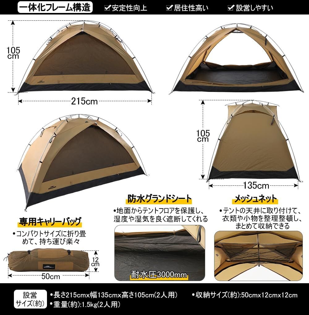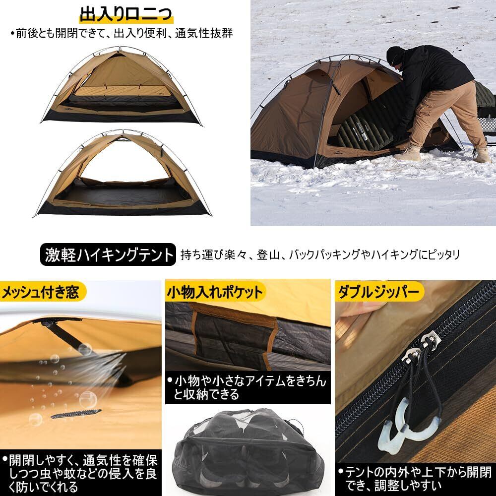 軽量:重量は(約)1.3kg(1人用)、1.5kg(2人用)、非常に軽量で、特に登山、バックパッキングやハイキング荷物に要求があるアウトドア活動に活躍しています。