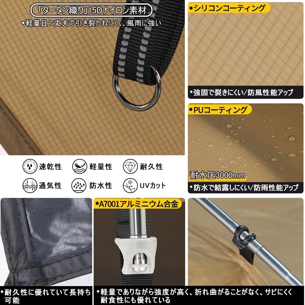 材質:幕体は「タータン織り」の15Dナイロン素材を採用、軽量且つ丈夫で引き裂かれにくく、風雨に強く、耐久性に優れていて長持ち可能です。一体化フレームにはA7001アルミニウム合金を採用、軽量でありながら強度が高く、折れ曲がることがなく、サビにくく耐食性にも優れています。