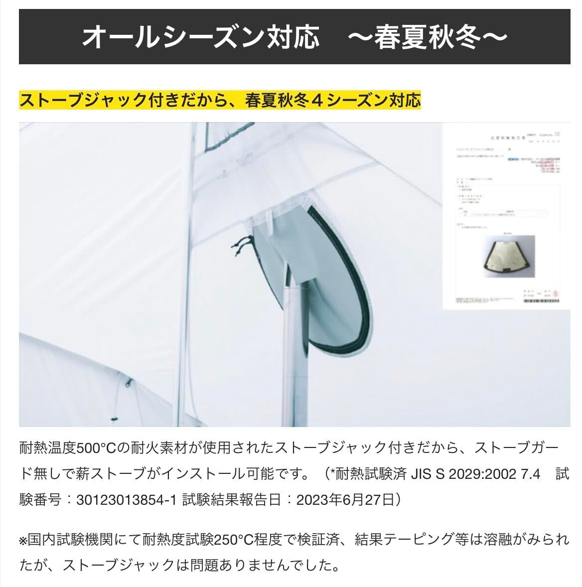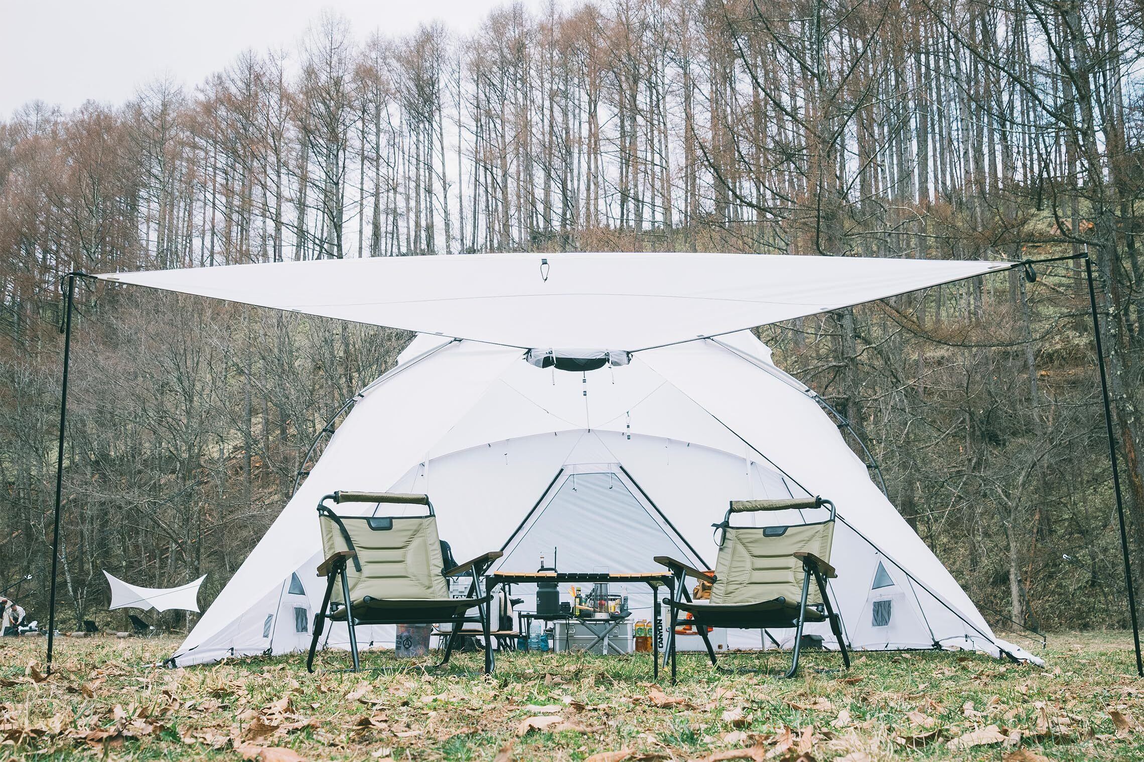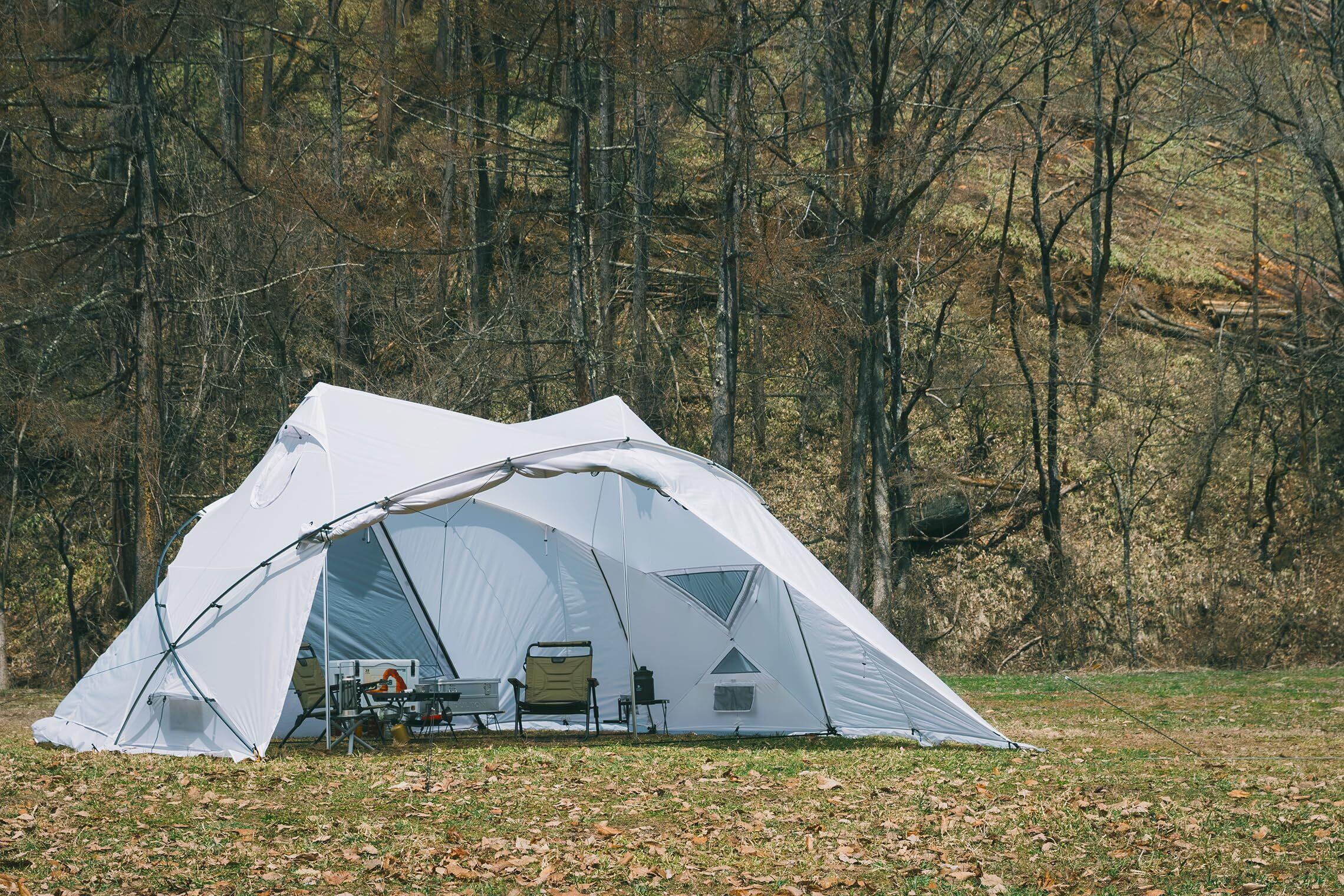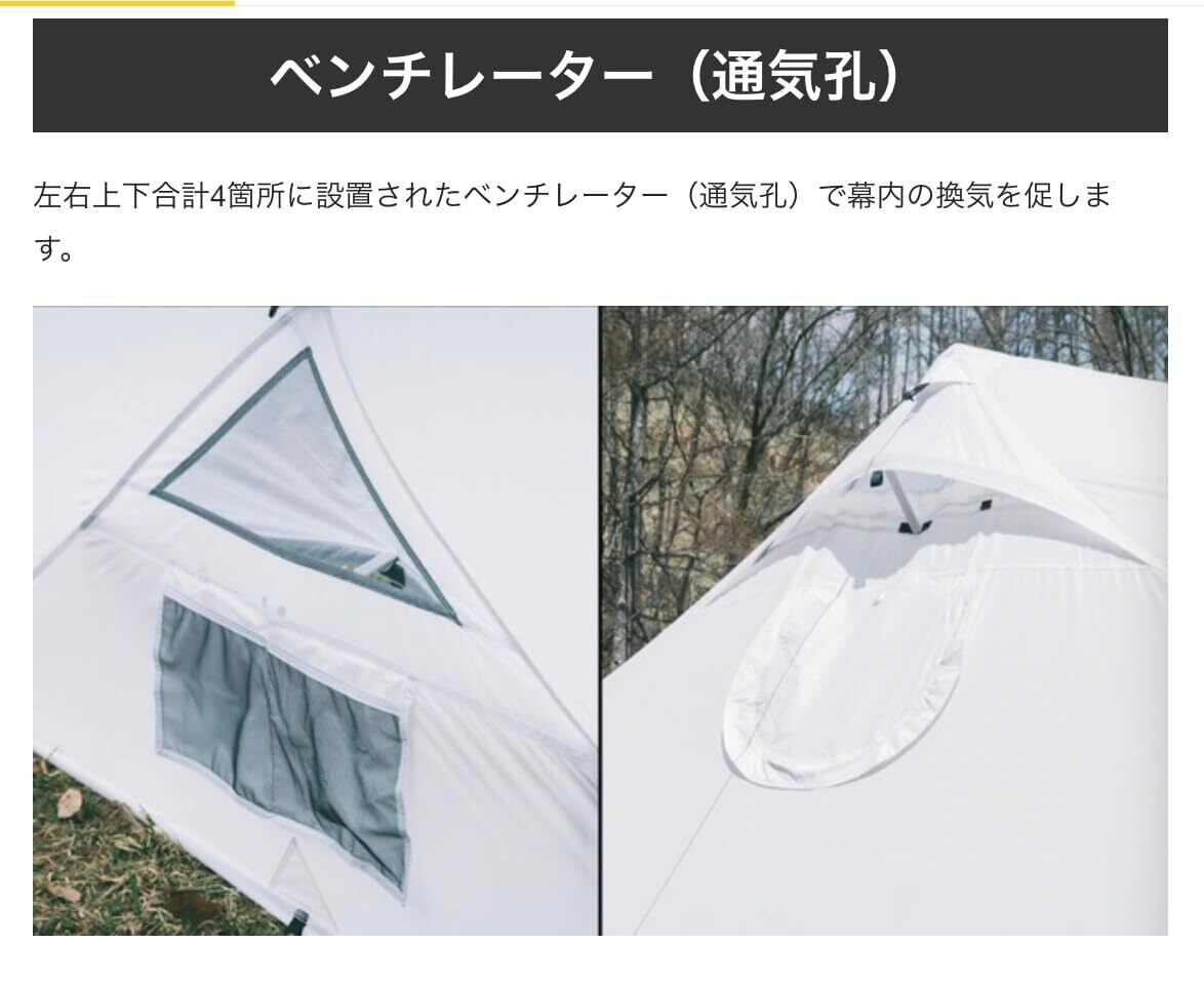 この大型幕は、少人数〜大人数での「おこもりキャンプ」として最適解です。キャンプテントとしてはもちろん、レクリエーションなどもできる大型サイズのツーポールテントです。大人数が収容できる避難所として活用出来ます。 最大約15人程がテーブルや椅子を並べた宴会も開催できます。スタンディングであればさらに大人数でのパーティーやレクリエーション場としてもご活用いただけるかと思われます。 星見窓や天窓、500℃弱まで耐熱効果のあるストーブジャック付きだから、薪ストーブもインストール可!