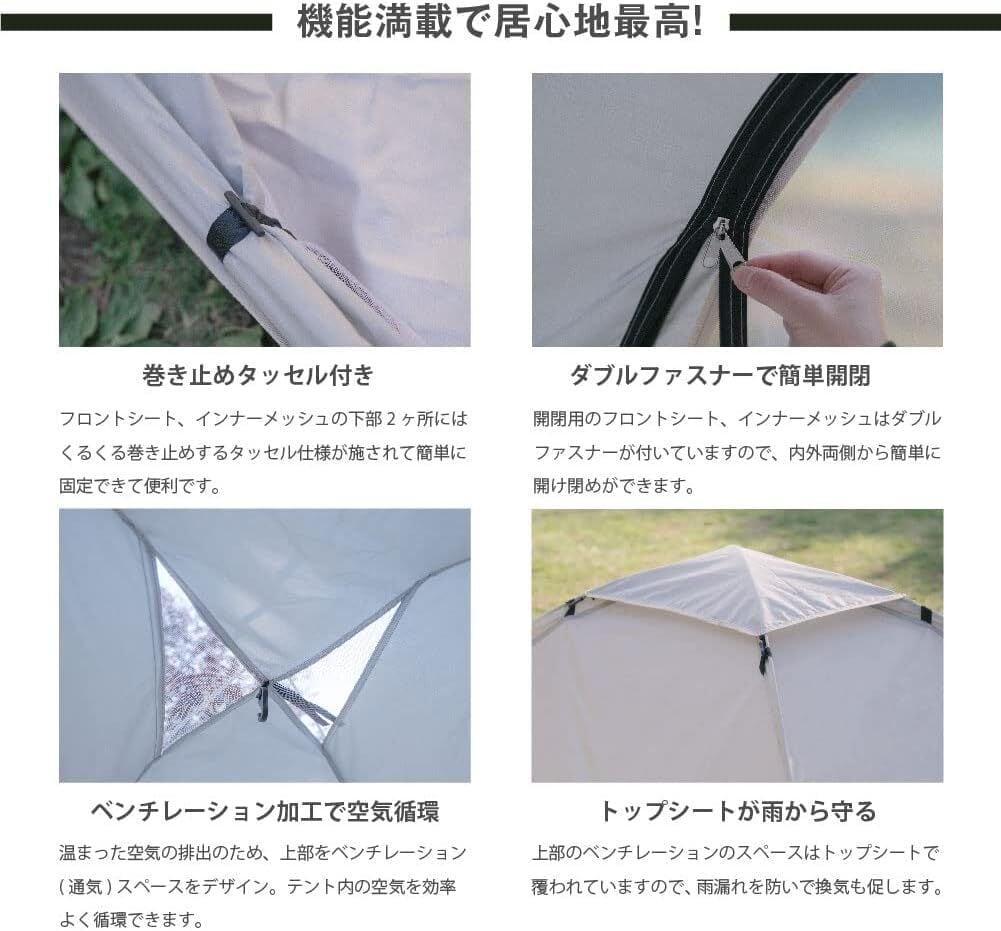 【メッシュ・モスキートシート/多機能】テントフロント対面2ヶ所のシート扉のインナーはメッシュシート仕様。視界と通気性の確保と害虫除けの網目が細かいモスキートシート。テント上部は内部の熱気を排出するベンチレーション(通気)スペースがあり、その上部にはトップシートで覆われて雨漏れを防ぎ、換気を促す構造です。フロント、メッシュシートはダブルファスナー仕様で内外両側からできて便利です。巻き止めできるタッセルで固定ができます。テント上部にはランタンやライトを吊るすループフック付き。収納時は円形に折りたたむ収納式。約Ø60*t2.5㎝に収納。重量は約1.4kgの軽量タイプ。持ち運びやすいキャリーバッグが付いています。車に積み込みやすくトランクの荷物が多い時でも安心です。