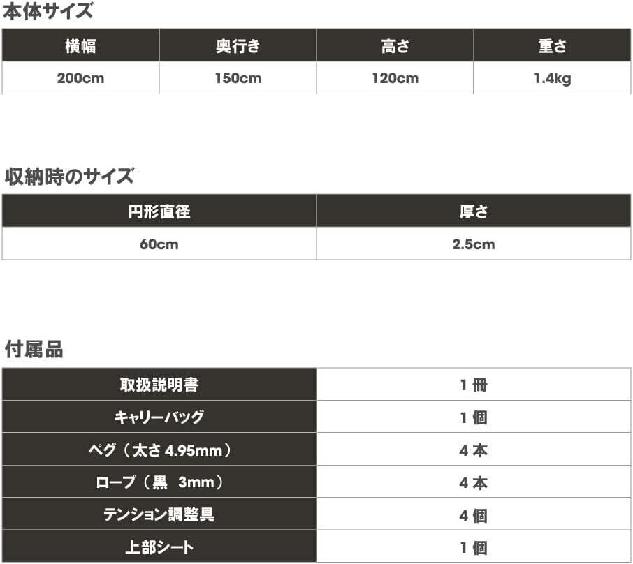 (仕様) 製品名:ホップアップテント 型番:sl-zp150-br 材質:ポリエステル(オックスフォード織)、グラスファイバー(フレーム) サイズ:組立時 約W200×H120×D150㎝ 収納時 約Ø60×t2.5㎝ カラー:ブラウン 重量:約1.4kg 付属品:収納キャリーバッグ(ポリエステル製)