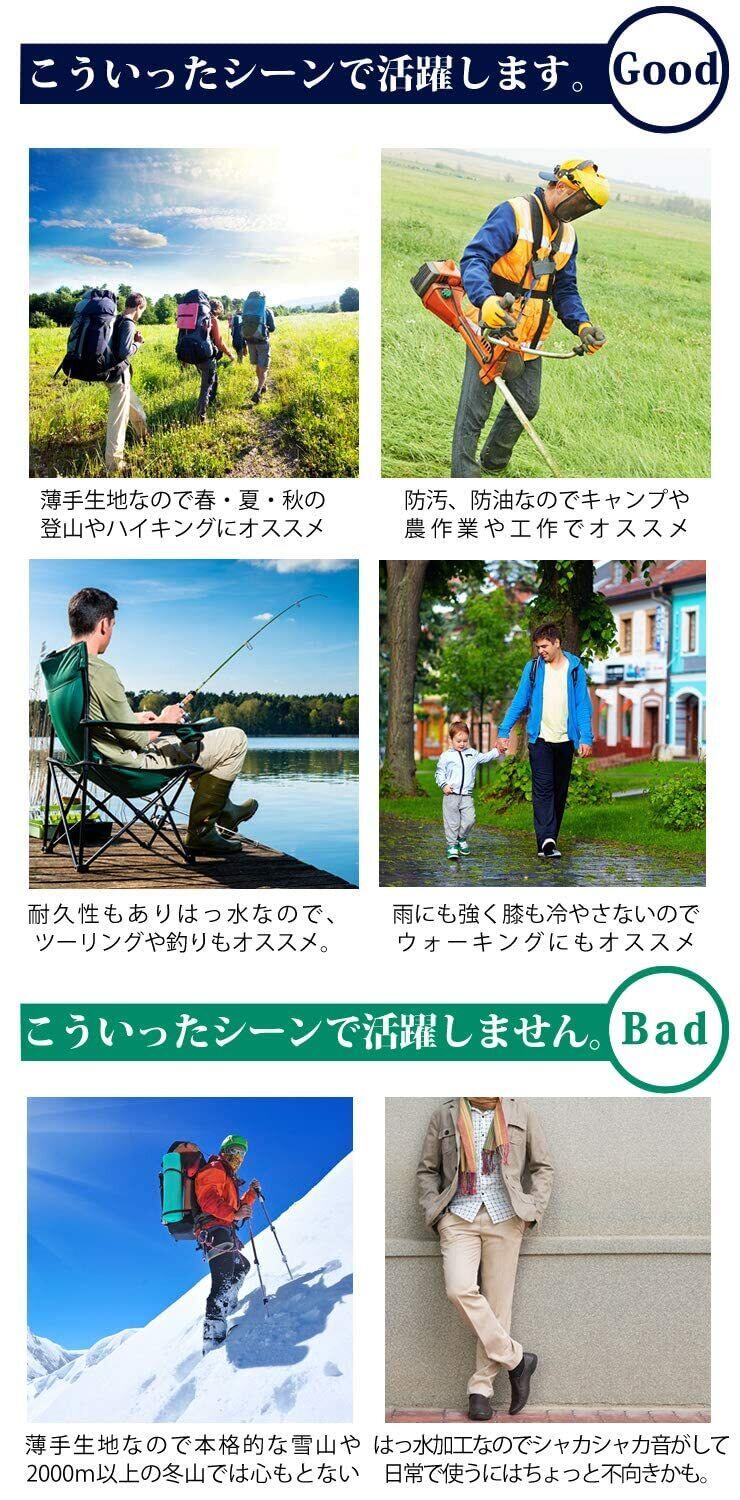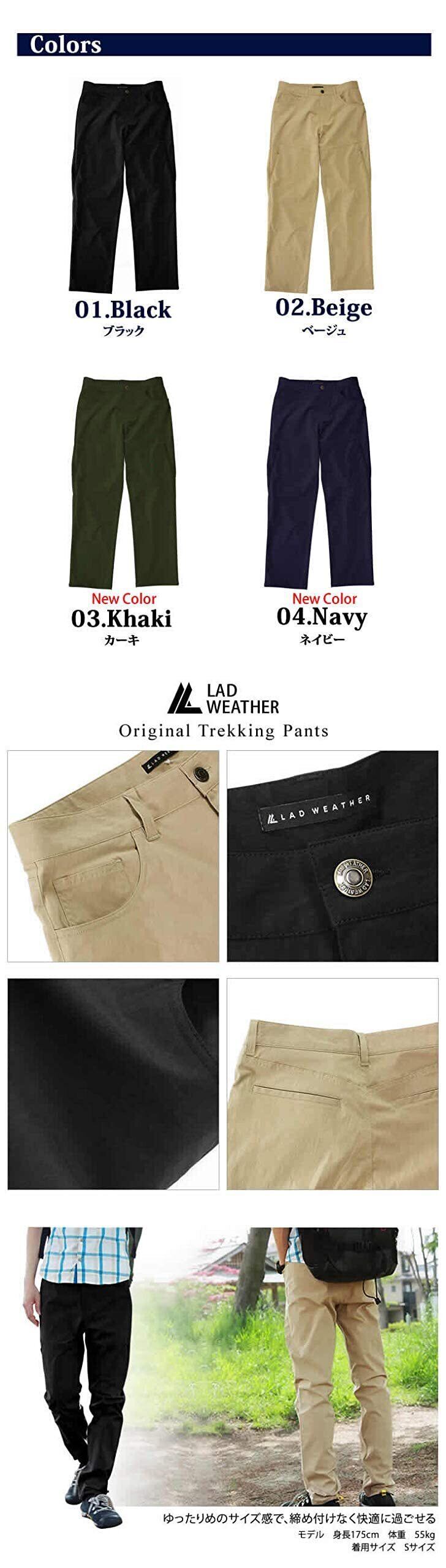全部で4色( 黒、ベージュ、カーキ、ネイビー )×4サイズ( S / M / L / XL )あります。 アウトドア ブランドのラドウェザーから、JIS規格をクリアした、はっ水性・防汚性・防油性・耐久性・速乾性に優れたトレッキング パンツ、ライトトレッキングシリーズ チノパンが登場!