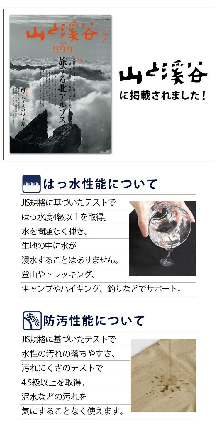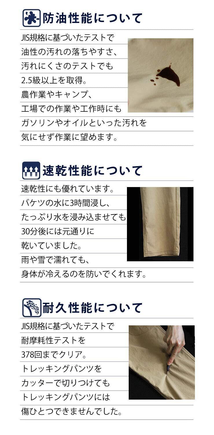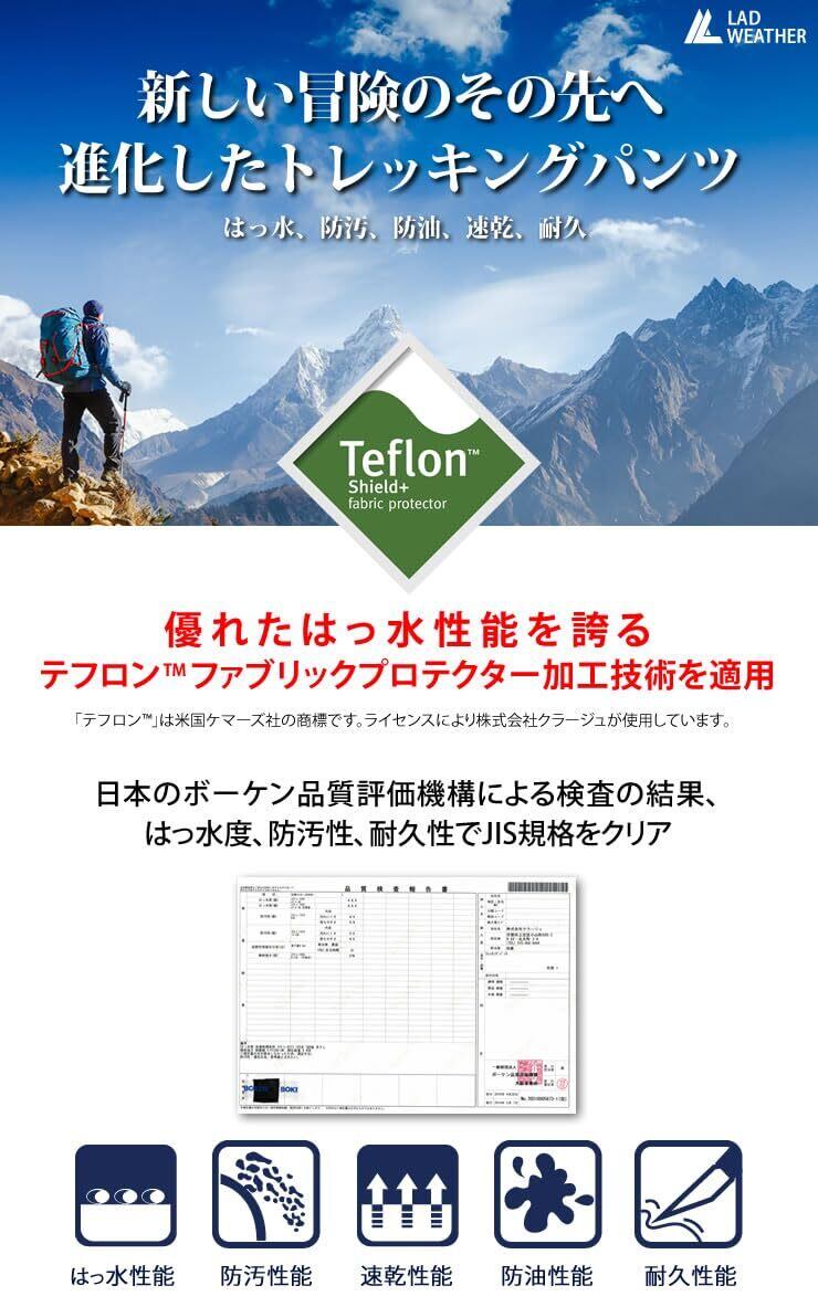 信頼のテフロン(TM)ファブリックプロテクター加工 。アウトドアでは、はっ水性能は必須。突然の雨に出会うこともよくあります。はっ水性がない生地だと身体が濡れ、冷えてしまい体調を崩す原因になります。このトレッキング パンツは、撥水度4級以上を取得。水を問題なく弾き、生地の中まで浸水することはありません。 ハイキングや山登り、ウォーキング、野外での活動、釣りなどでサポートするでしょう。