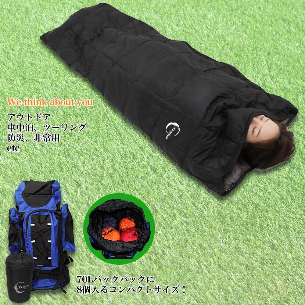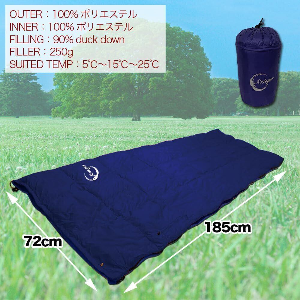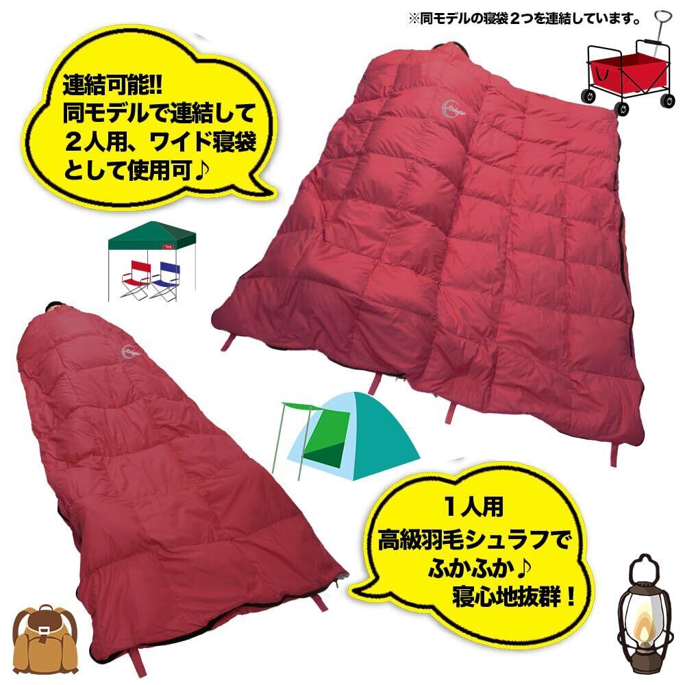 コンパクトサイズ羽毛寝袋です。 軽量でコンパクトサイズなので、リュック収納、ツーリングの際など 大変役立ちます。 非常用、防災用としても場所を取らないので常備品としても。 また同タイプの寝袋なら連結が可能です。 同タイプの寝袋を重ね使用することで使用限界温度-10℃の寝袋にもなります。 ※使用限界温度とは: 基本的にはおすすめしませんが厚着の防寒着などを着込んで耐えられる限界の温度のことを指します。 ※収納袋より取り出し、充分に空気を含むことでより暖かく使用していただけます。