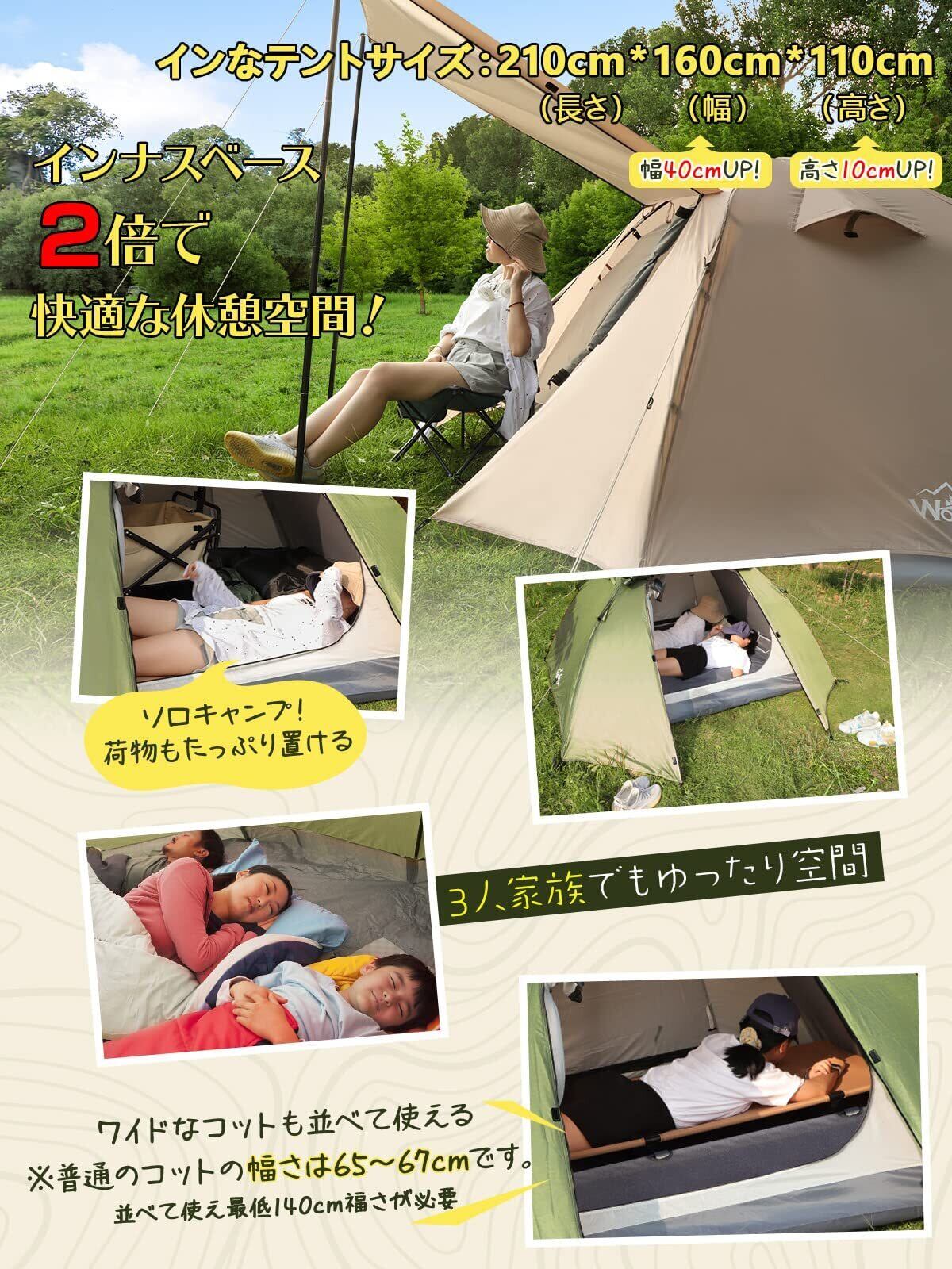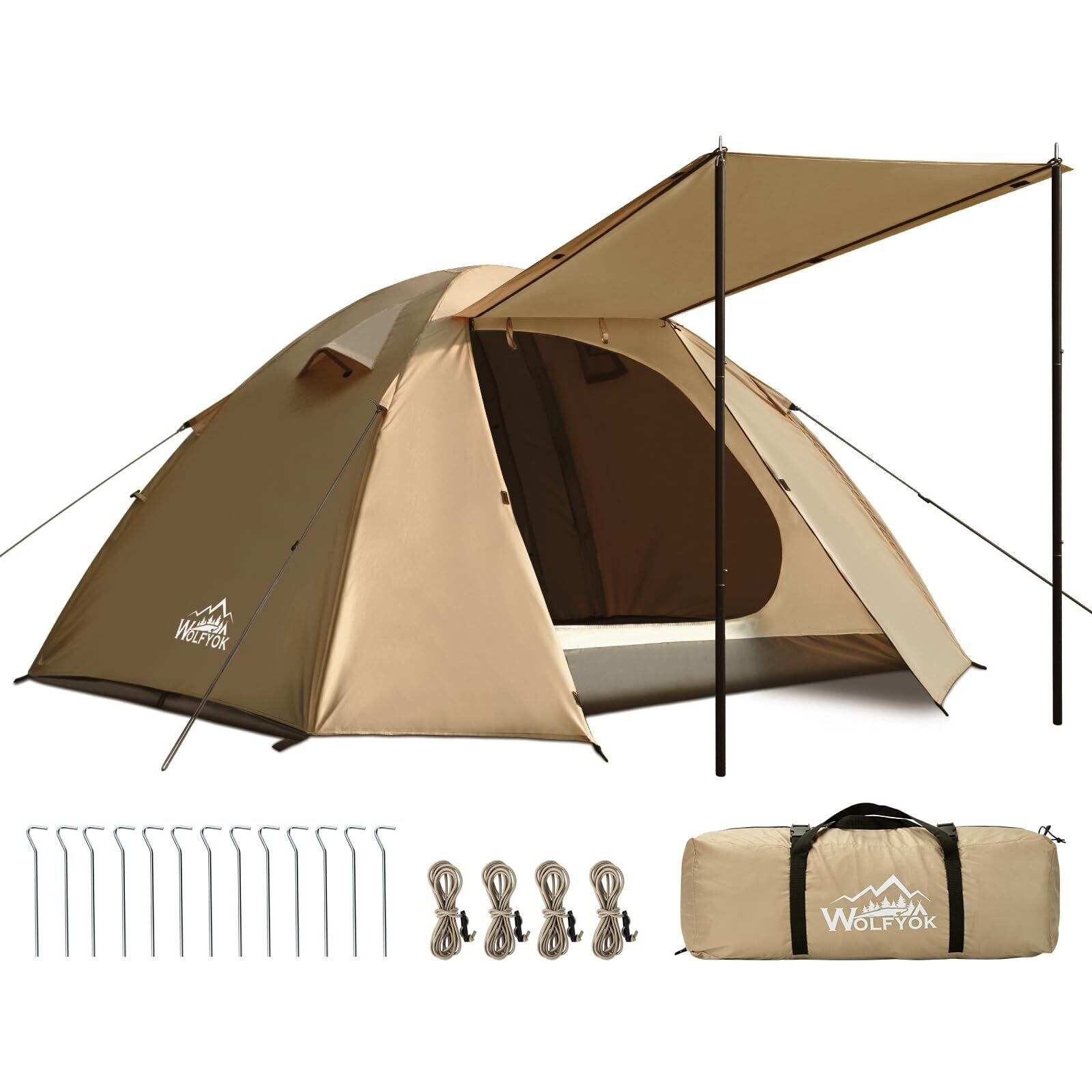テント 1-4人用 テント ファミリー 【最大肩幅が65cmの4人就寝】 4000mm耐水圧 広い前室 ソロキャンプテント コンパクト 大空間 撥水加工素材 開閉式ベンチ 二重層構造 4シーズン適用 wolfyok outdoors 簡単設営 軽量 UVカット 通気防風防雨防雪 アウトドア/登山/釣り/ピクニック/防災用/初心者キャンプ用品ギア【国内ブランド】