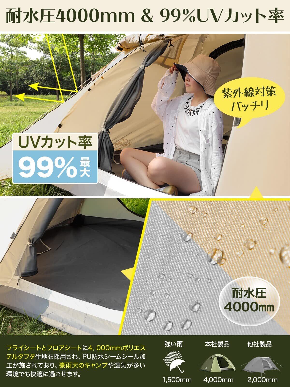 【耐水圧4000mm】フライシートに耐水圧4,000mmのポリエステルタフタ生地を採用しています。また、PU防水シームシール加工が施されており、天候が崩れやすい初夏のキャンプでも安心します。【寒暖差が対応】5月になると、昼夜の寒暖差が目立ち始めます。四面メッシュ仕様のインナーテントは通気性に優れ、日中の暑さを軽減します。さらに、標準で付属するインナーマットに他のグランドシートを敷けば、それだけでかなり冷気を遮断でき、秋冬の夜でも温かく過ごせます。