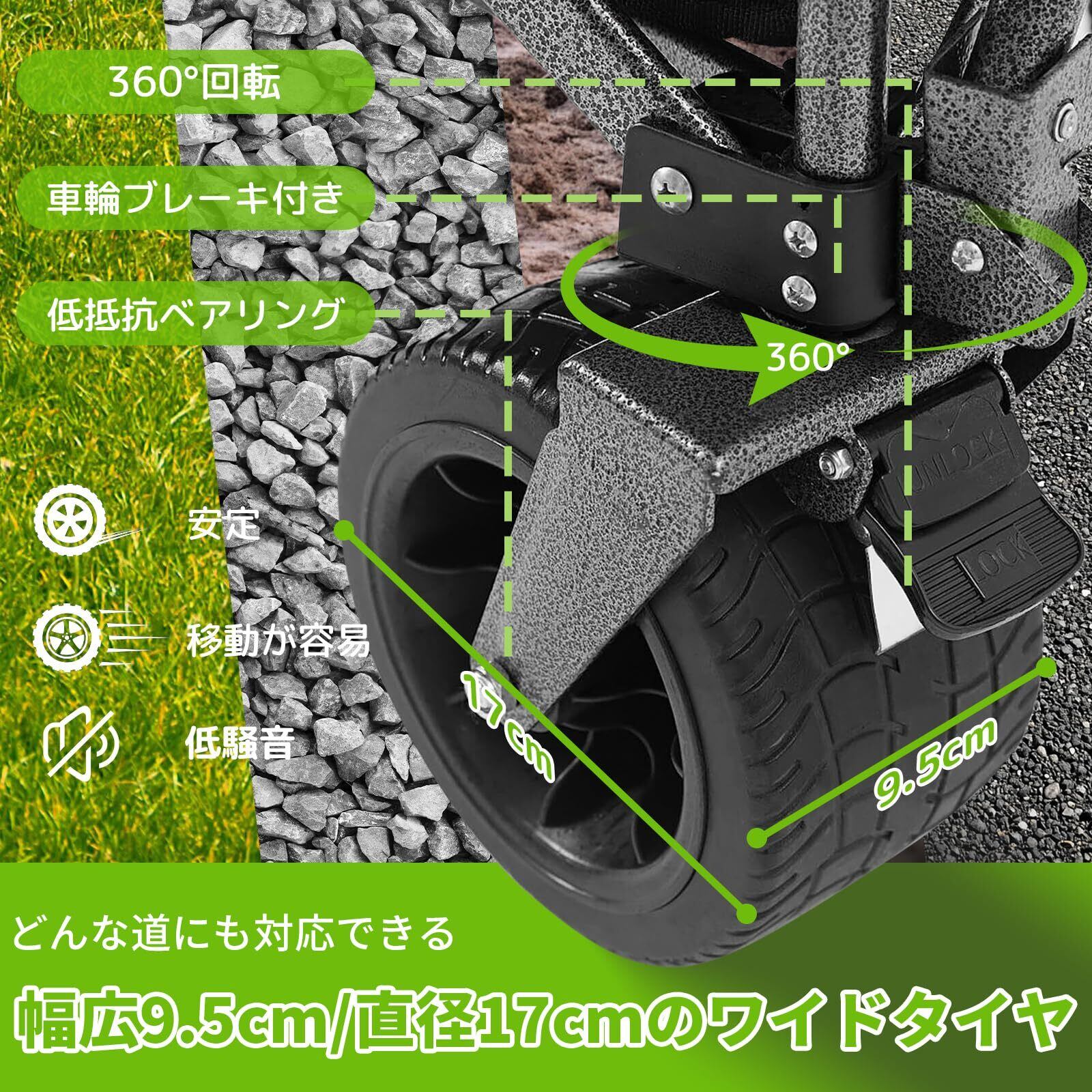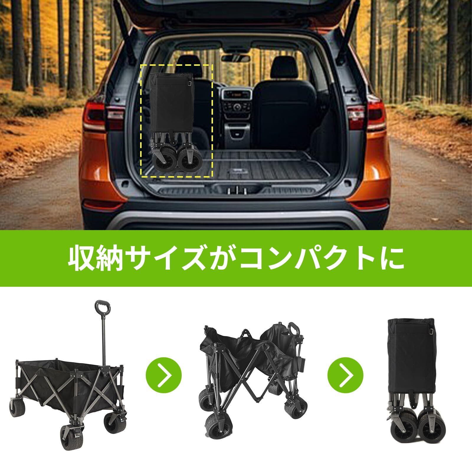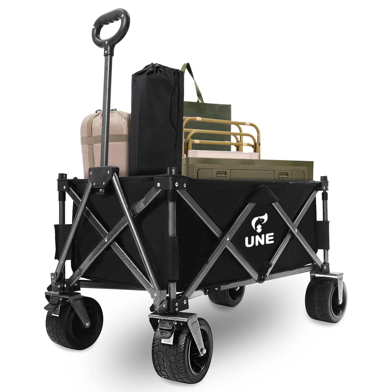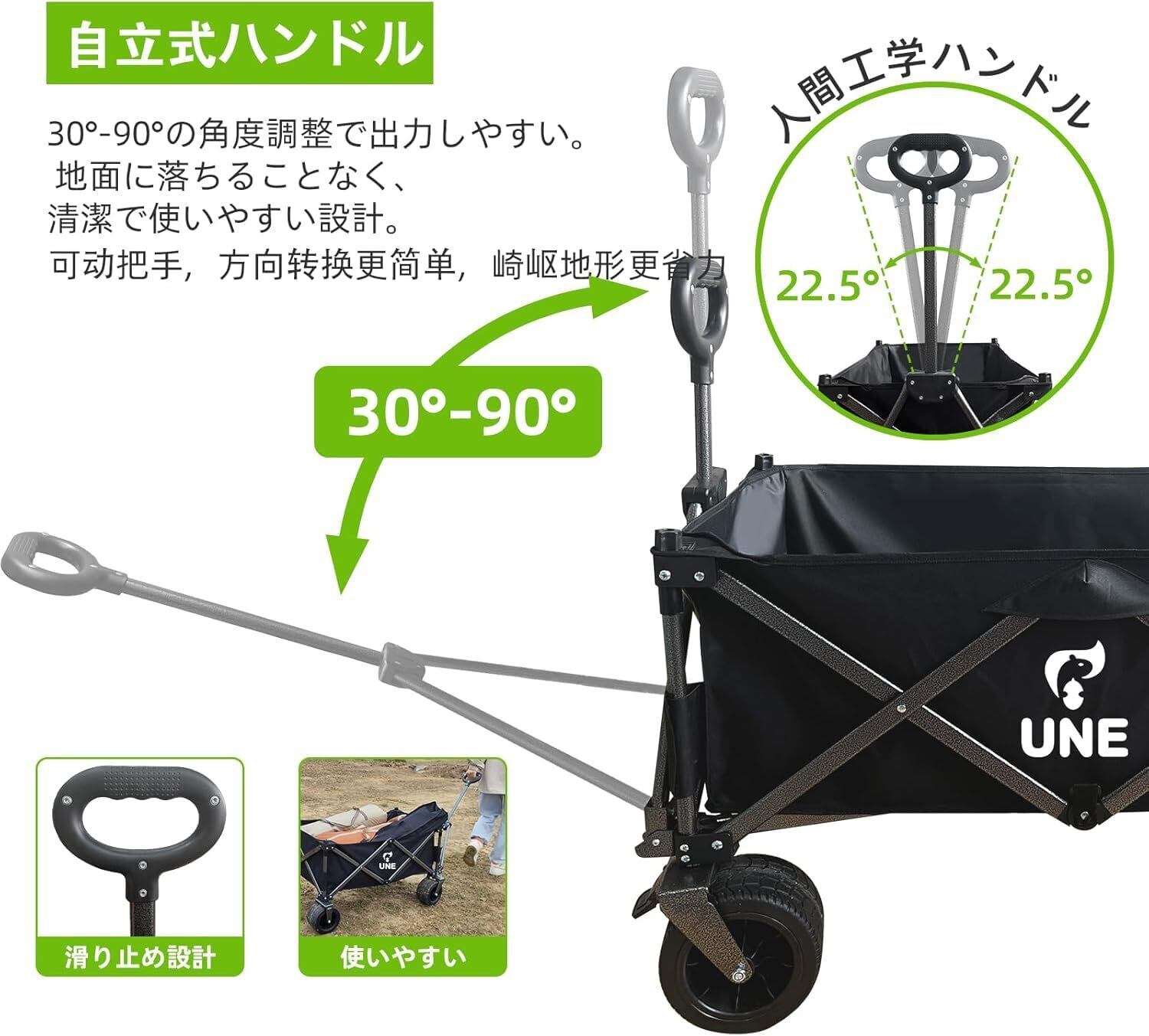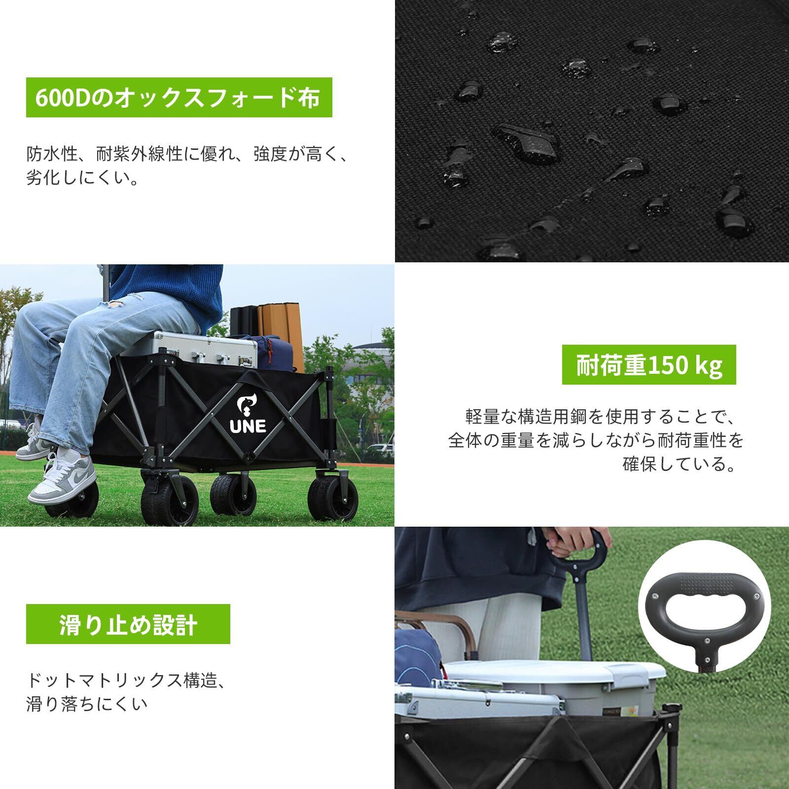 UNE キャリーワゴンラベルカー 折り畳み【9.5cm特厚タイヤ 収納付き】大容量150L 耐荷重150kg ワンタッチ折りたたみ ブレーキ付き 山道・キャンプ・荷物運搬・アウトドアトラベルカーに