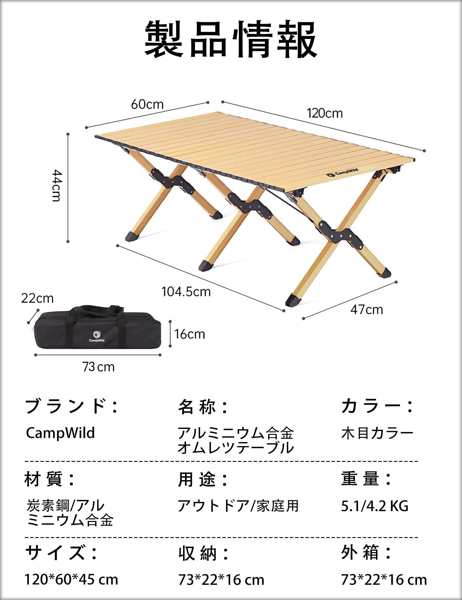 便利で多機能なデザイン:この折りたたみ式キャンプテーブルは、幅120cm、長さ60cm、高さ45cmというサイズで、アウトドアキャンプやハイキング、バーベキューなどの屋外アクティビティだけでなく、室内のダイニングテーブルやパーティーでも活躍します。屋外の自然環境でも、屋内の快適な場所でも、様々な用途で利用できます。