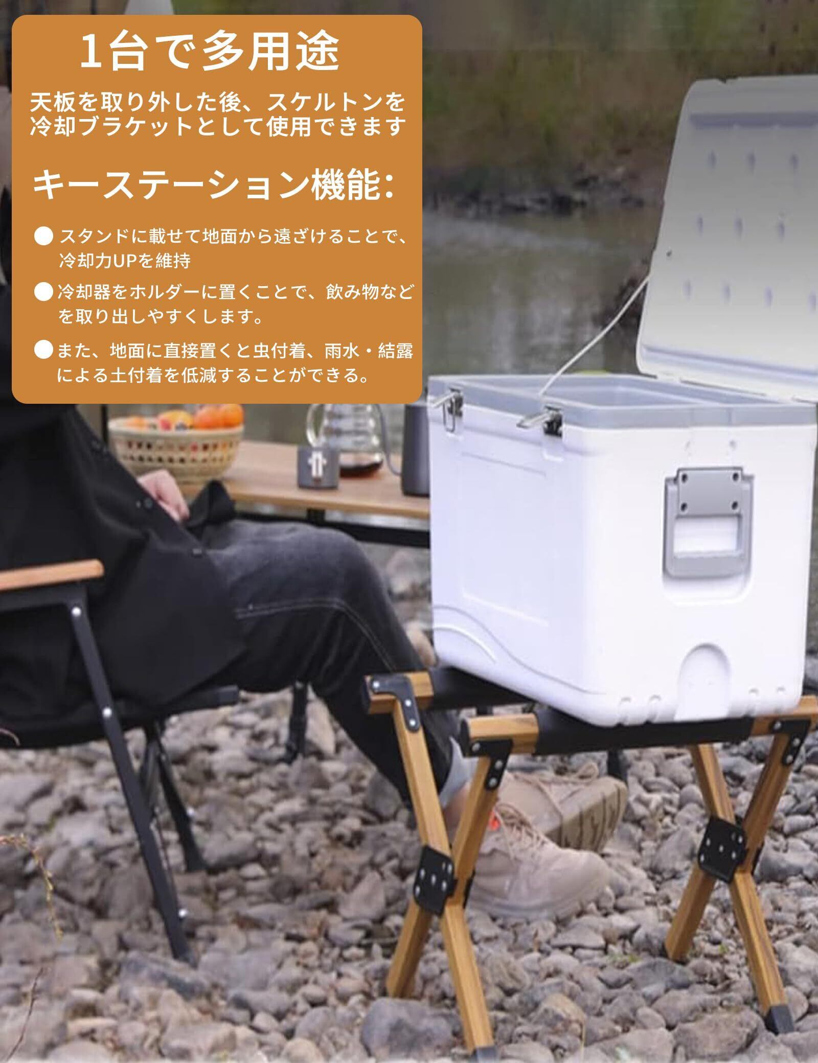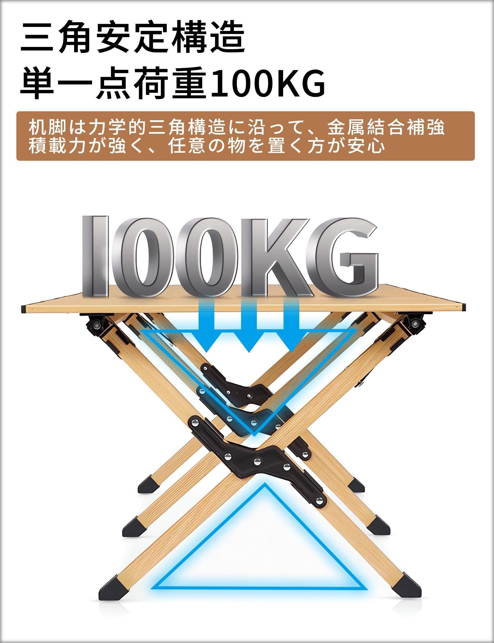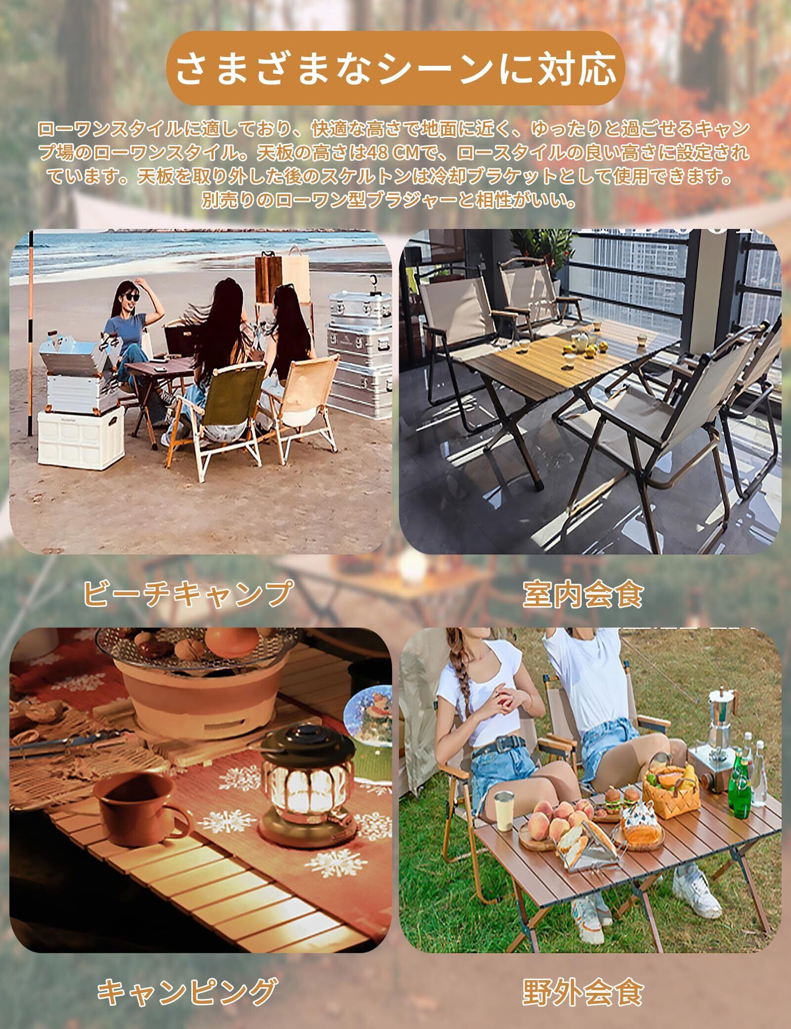 独自のスタイリッシュ風:特徴的なX型の支持構造により、このテーブルは安定性を保ちつつ、広い支持面積を提供し、耐荷重能力を高めています。木目調の天板は美しく自然なデザインで、屋外や室内の環境に上品な雰囲気を醸し出し、アクティビティをさらに楽しいものにします。あなたのキャンプやパーティーに独自の魅力を加えます。