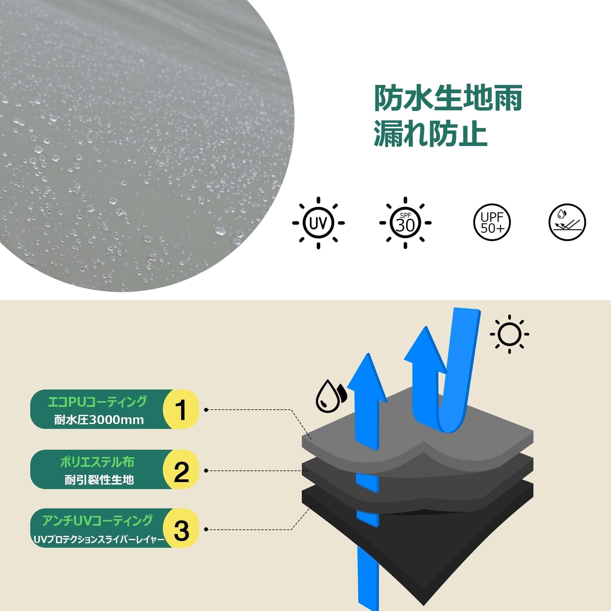 【優れた防水性能】防水タープは210T破れにくいポリエステル生地で作られ、防水で破れ、摩損、腐食に耐えられます。生地の表面に撥水加工処理済みで雨に強い防水機能を備え、耐水圧が3000mmであり、急に雨が降ってものんびり対応ができます。生地の特製より速乾なので、雨や雪などに濡れでもすぐ乾く可能です。また、生地には高耐水加工が施されており、大雨にも対応できます。急に雨の場合、安全の雨避け場所を提供いたします。