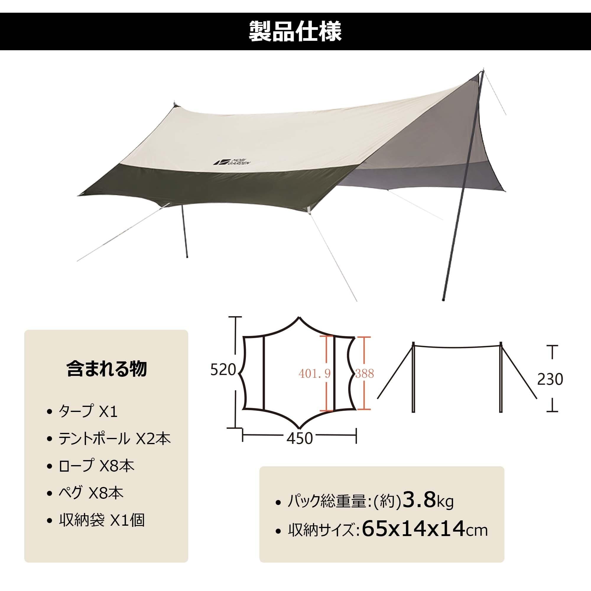 【タープ仕様】 素材:リップストップ加工210Tポリエステル生地;耐水圧:PU2000MM;展開サイズ:約520x450x230cm、収納サイズ:約65x14x14cm;重量:3.4kg;カラー:オリーブグリーン+ホワイト;付属品: タープ本体、ペグ×8本、ロープ×8本、ポール×2本。レジャー、海、山、川でのキャンプやバーベキューはもちろん、ヤード、中庭、運動会やピクニ、ク、野外フェスなどに最適です。