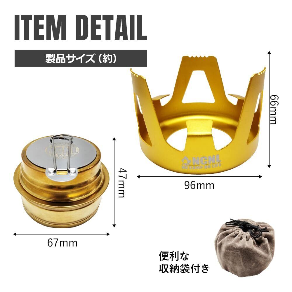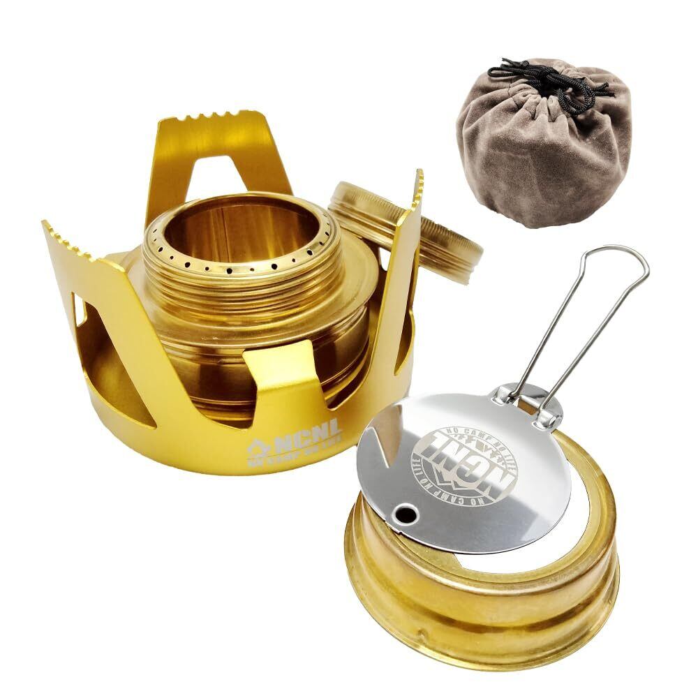 NCNL(NO CAMP NO LIFE) アルコールストーブ バーナー キャンプ 軽量 五徳 蓋 登山 ソロキャンプ アウトドア用品 キャンプ用品 収納袋付き (ゴールド, 燃料なし)
