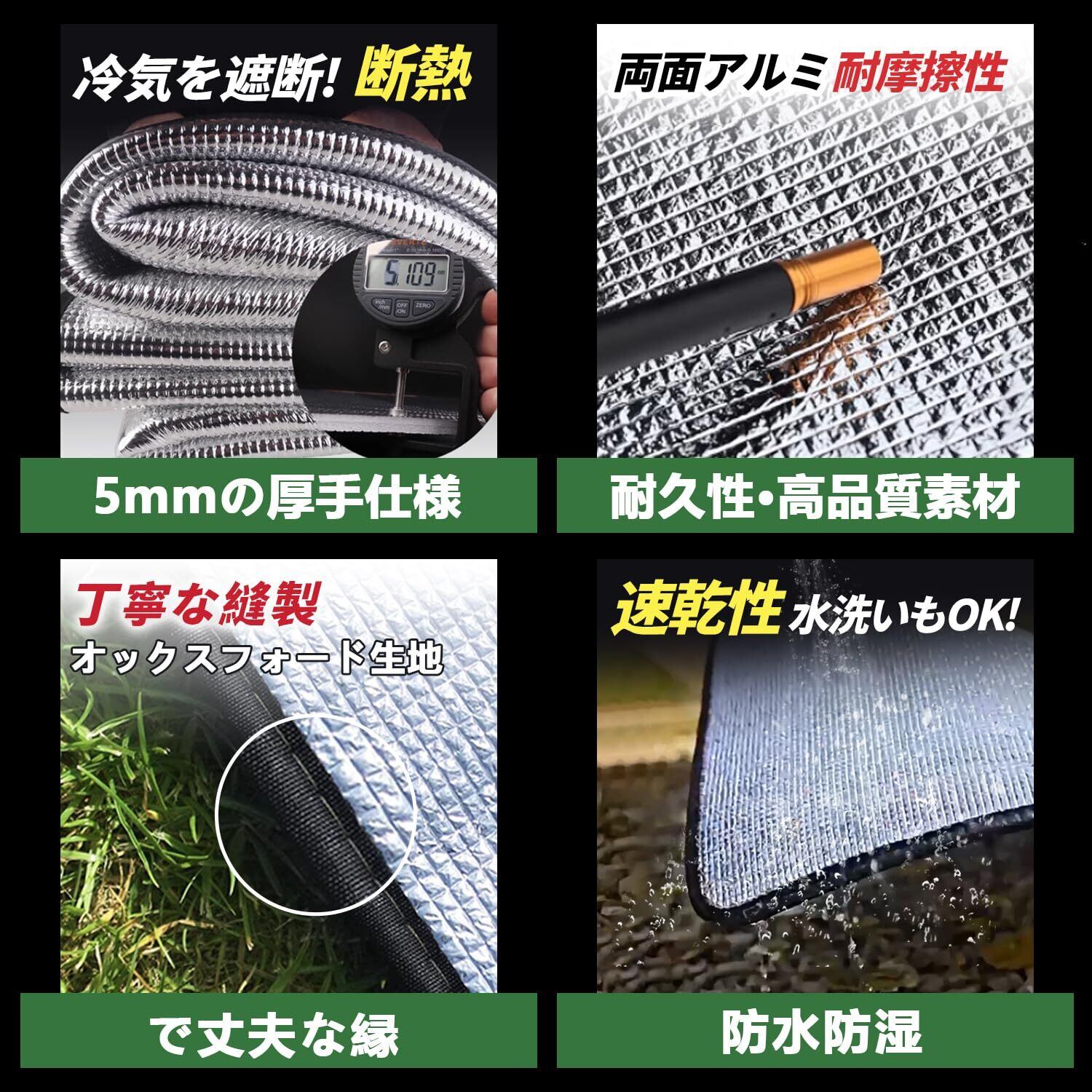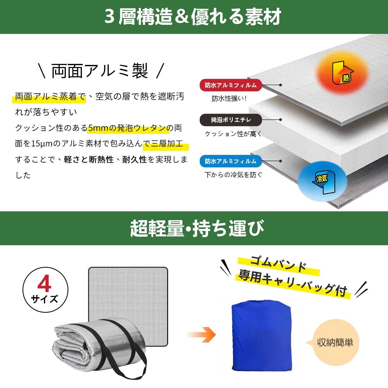 【保温性、断熱性が抜群です】また、炎天下では光を反射し高温を防ぐ効果もあり、アルミシートは水や汚れを強力にはじく撥水加工が施されているため、濡れた地面や草の上に敷いても、雨や汚れ、水分を弾いてシャットアウトし、長時間座