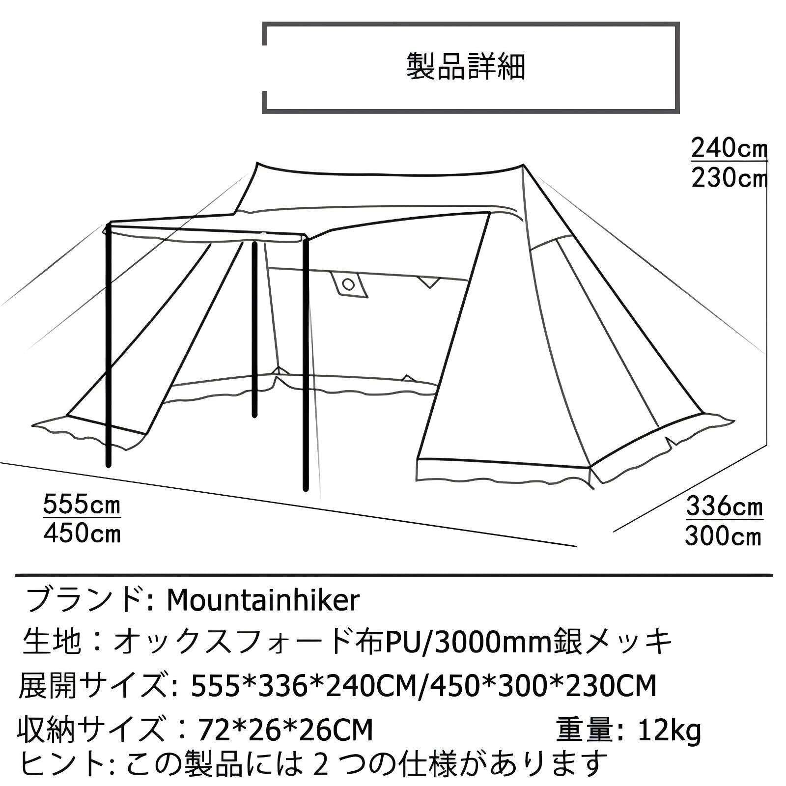 【製品仕様】:展開サイズは約:長さ約450cm、幅300cm、高さ230cm, 収納サイズは約:72cm*26cm*26cm、重量は約12KG