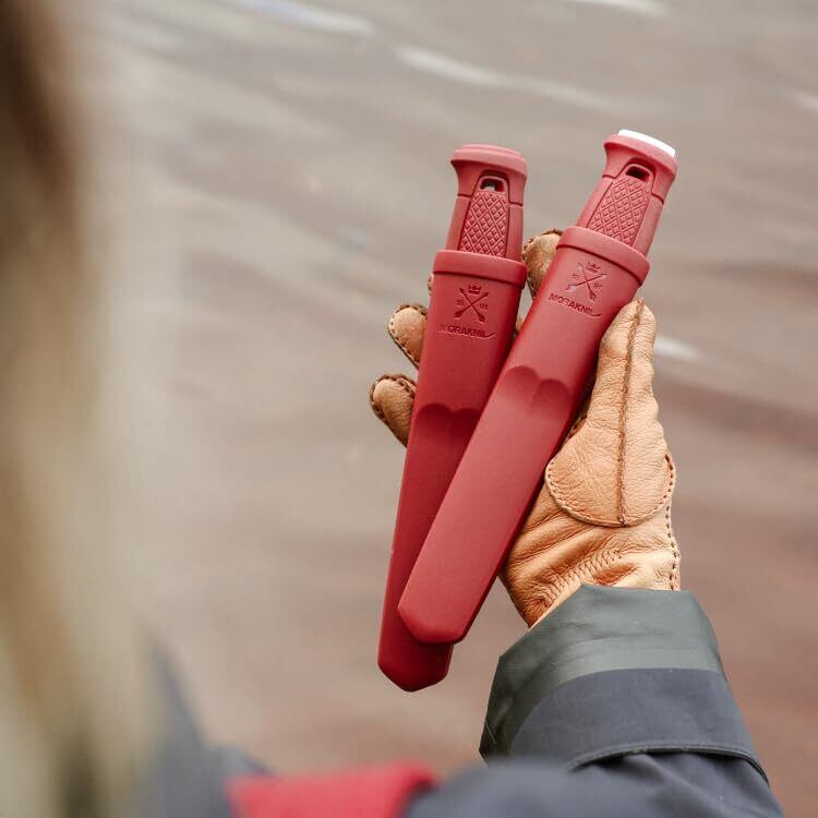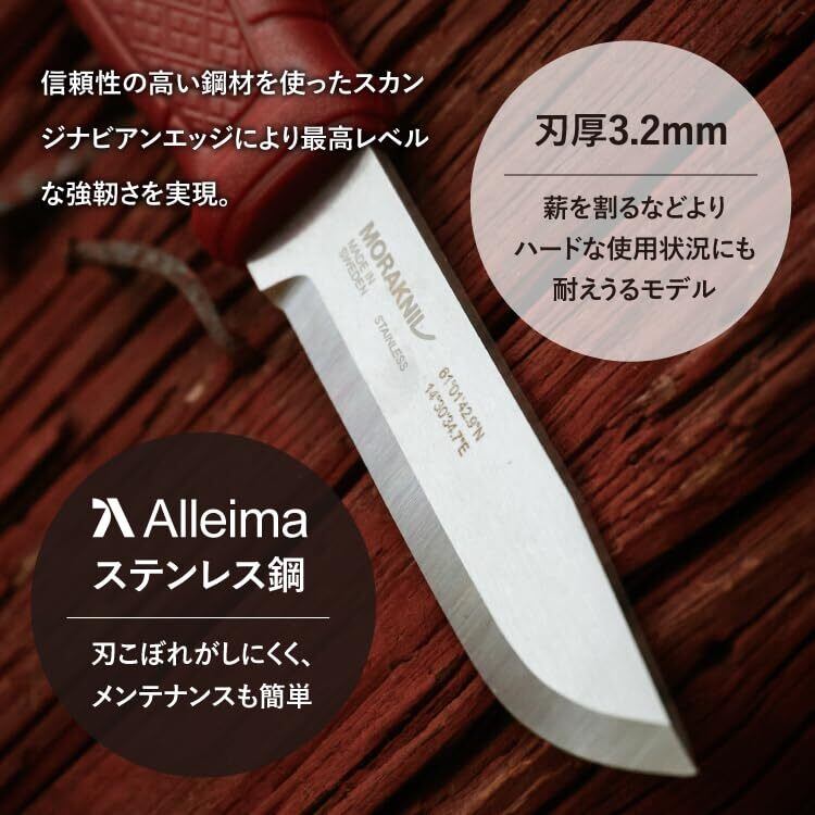 【頑丈な構造と丈夫な刃】 モーラナイフのアウトドアナイフ全ラインナップのなかで、最も強靱で重量感のあるハイエンドモデル。ブレードは刃厚3.2mmのフルタング(鋼材がブレード幅でグリップエンドまで通っている)構造になっており、非常に耐久性が高いモデルとなっています。また、高品質のステンレススチール製のブレードはスウェーデン Alleima(旧Sandvik)製のステンレス鋼を採用。近年SDGsに取り組む企業が多い中、モーラナイフも80%以上がリサイクルされたスウェーデン鋼からなる合金で作られています。そのステンレス鋼材を、モーラナイフ自社工場でこだわりの製法で製造し十分な耐久性を持った鋼材を生み出しています。また、切れ味の鋭い刃はスカンジナビアンスタイルの特徴的な形状となっています。