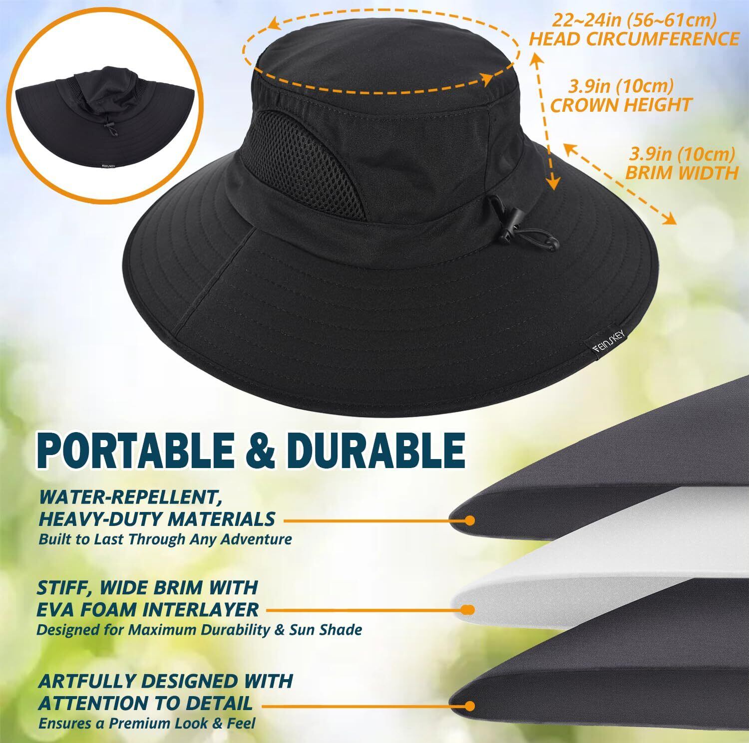 【UV対策&防水】広いつば10センチが有害な光線から顔と首を守ります。防水ポリエステル素材は細かい雨の浸透を防ぎますが、中雨や大雨の中での使用はお勧めしません。なぜならあなたの頭が濡れてしまうからです。