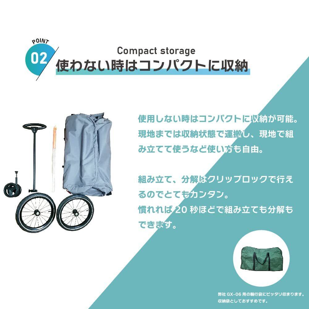 手押しでも、自転車でも使える! キャリーワゴン&サイクルトレーラーの2WAY仕様で、レジャーの楽しみ方がもっと広がる!簡単に組み立て&装着可能。 後輪が取り外せるので、コンパクトに収納できる 工具を使わずに簡単に組み立て可能です。 自転車への装着は、まずは後輪のナットを外して装着用のアタッチメントを取り付けます。 アタッチメントを取り付けた後は、ワンタッチで自転車に装着できます。