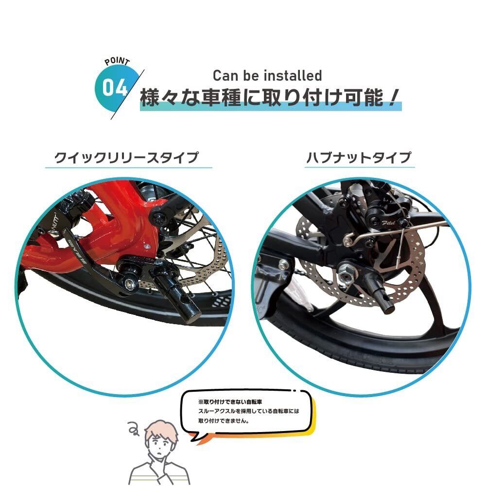 取り付けできる自転車 後輪の留め具がハブナットタイプの自転車に取り付け可能です。クイックリリース・スルーアクスルなどを採用している自転車には取り付けできません。 ハブナットのサイズは19mmと16mmのものが適合します。 (19mm用・16mm用両方のアタッチメントが付属します)