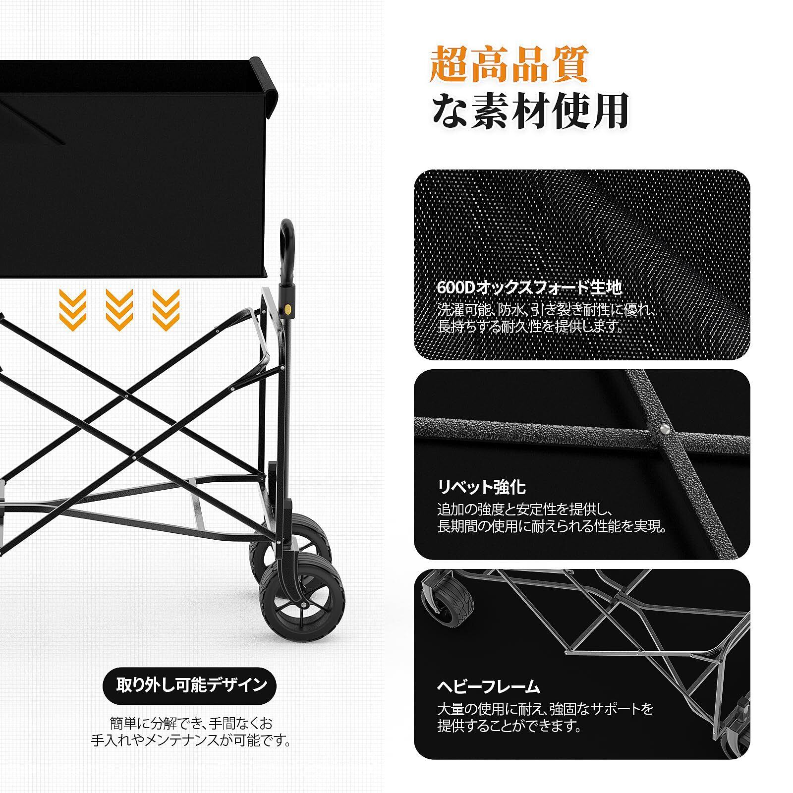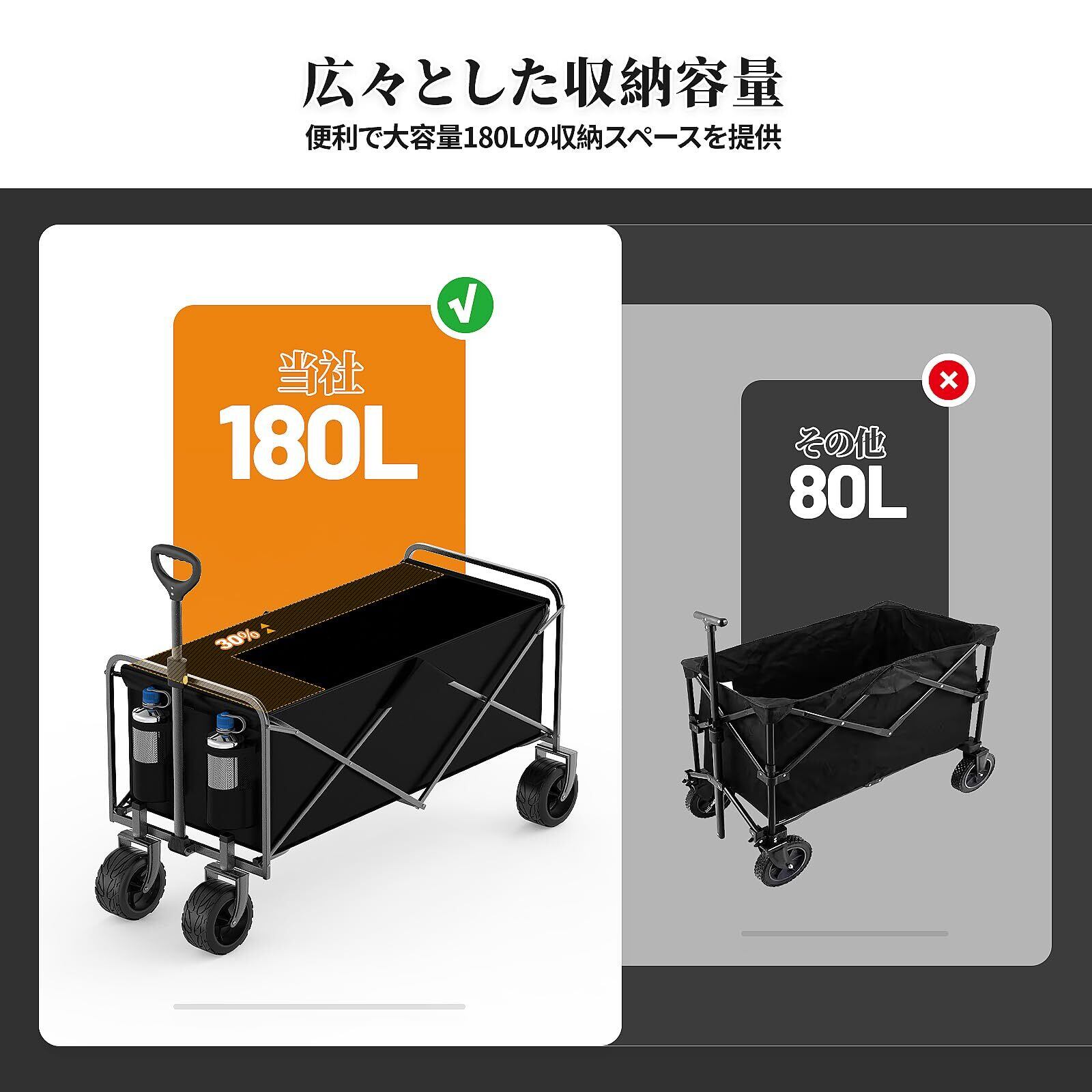 【大容量&コンパクト設計】最新型折りたたみ式キャリアカートは、180Lの収納容量を実現。展開時サイズ(約100cm×48cm×87cm)、折り畳み時(84cm×54cm×19cm)とコンパクトに収納可能。メッシュカップホルダー2個付きで、飲み物や小物も整理しやすく、キャンプ道具・買い物・育児用品まで幅広く対応。