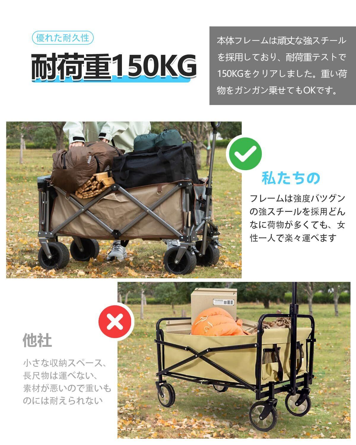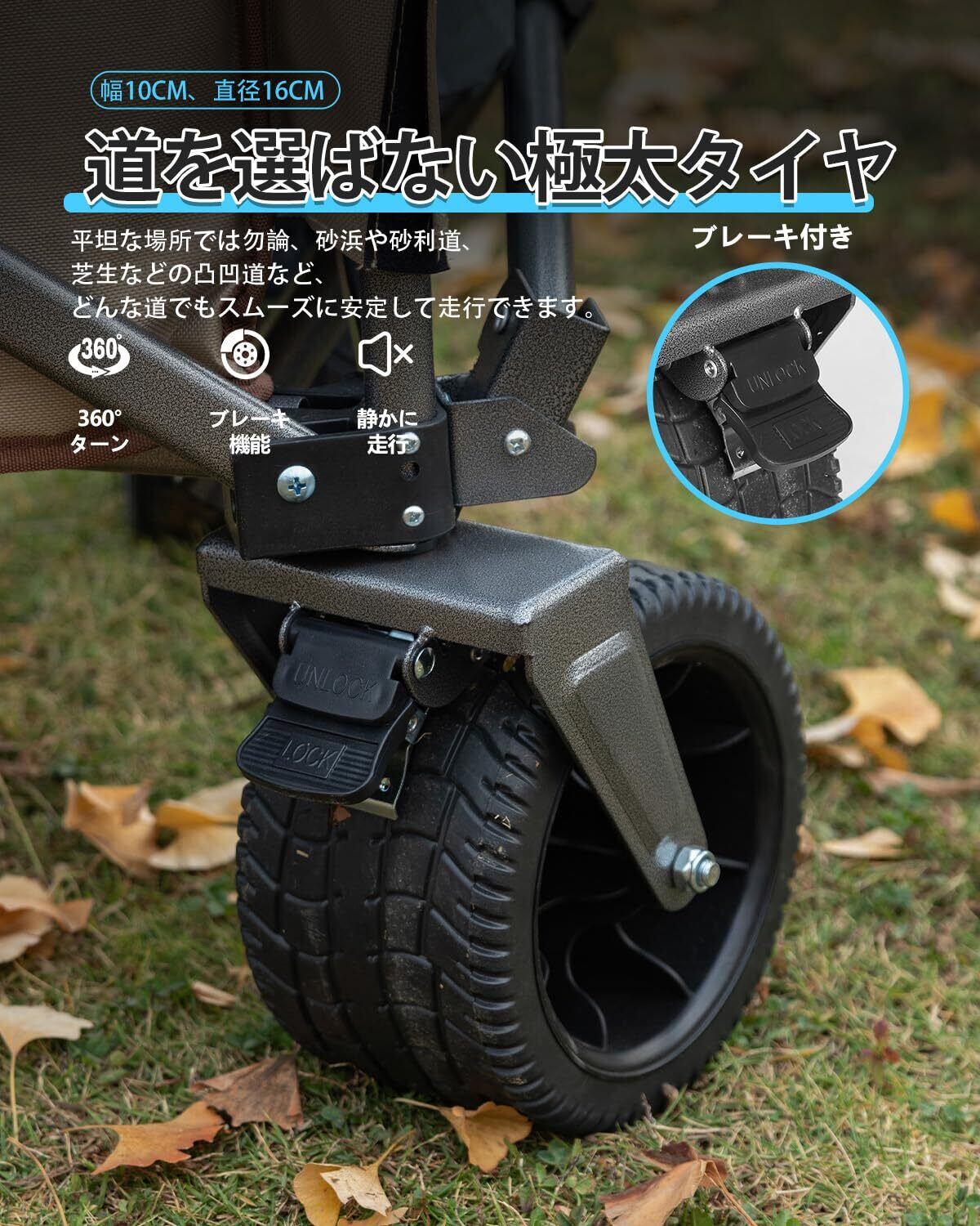 【道を選ばない極太タイヤ×ブレーキ機能】キャンプカート 前輪にはブレーキが装備されており、車輪と方向の両方を同時に効果的にロックして、キャリーワゴンの動きを停止して防ぎます。 折りたたみ式キャリーワゴンには、硬い砂、草、あらゆる種類の複雑な地面に対応できるように作られた 4 つの 直径20cm・幅10cmの特大タイヤを使用し、 全地形対応ホイールが付いています。 強力な耐摩耗性、静かな衝撃吸収性、耐摩耗性、ドラッグマークなしを特徴とし、ホイールの耐衝撃性を高めます。
