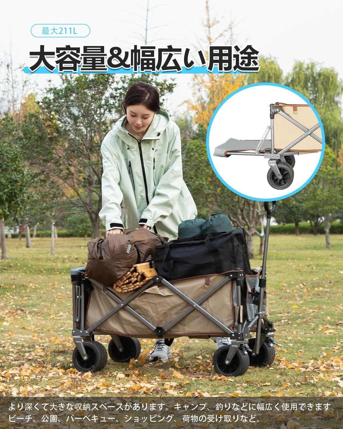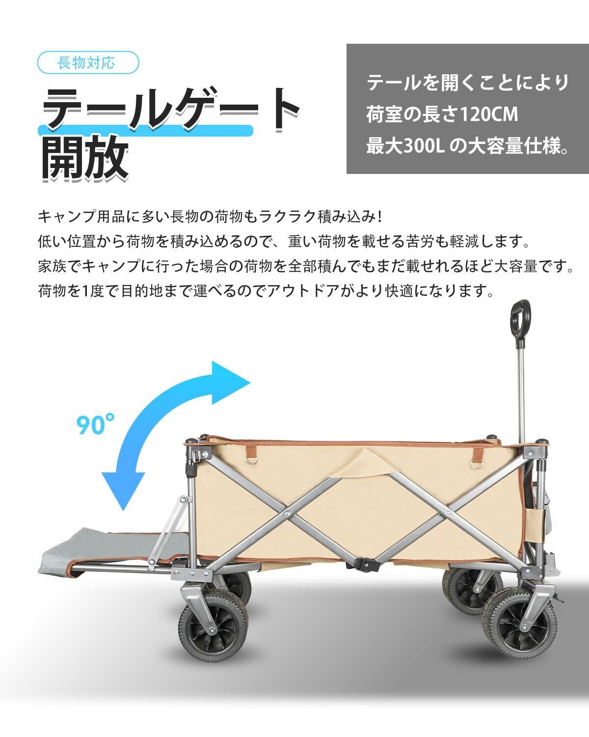 キャリーワゴン 長物対応【荷室の長さ120cm】キャンプカート 特大容量 300L アウトドアワゴン 自立収納 コンパクト ワンタッチ収束式 折りたたみ式 頑丈 耐荷重180kg カップホルダー 幅10cmのサイレントユニバーサルホイール付き アウトドアユーティリティ 調節可能なハンドル 釣り キャンプ 庭 スポーツ ピクニック ショッピング用