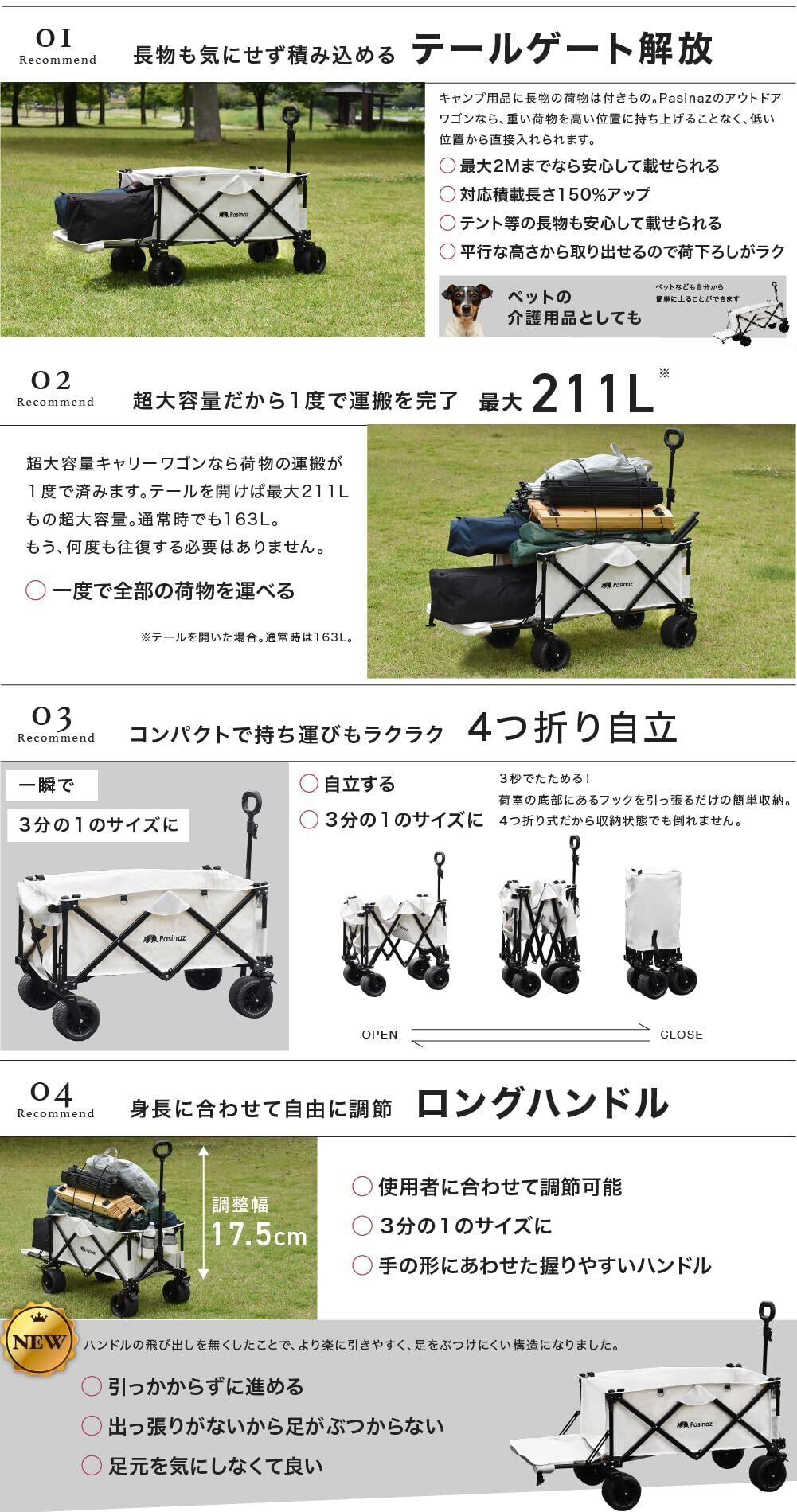Pasinaz 2023年 NEWモデル アウトドアワゴン キャリーワゴン 耐荷重180kg 大容量 211L キャリーカート キャンプワゴン 折りたたみ 荷室拡張 4輪 伸縮ハンドル 頑丈タフ ワイドタイヤ タイヤロック 軽量 コンパクト 自立 アウトドアキャリー アウトドア キャンプ 大型 おしゃれ (ブラック)