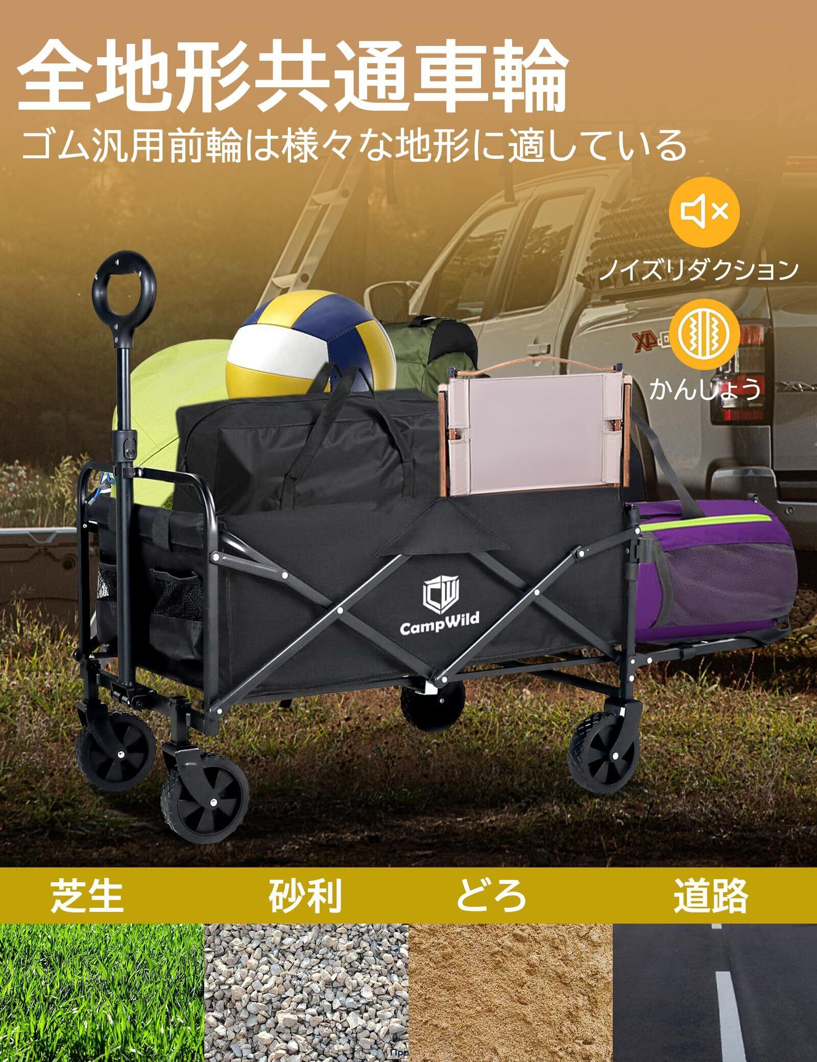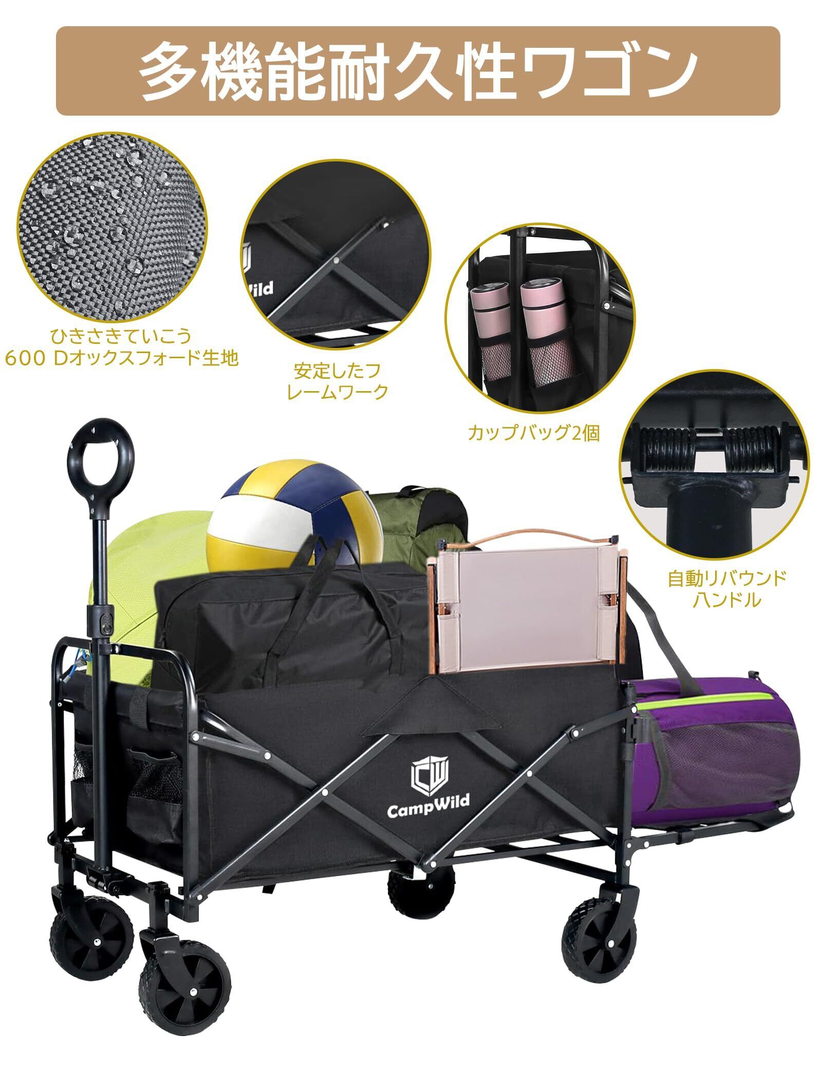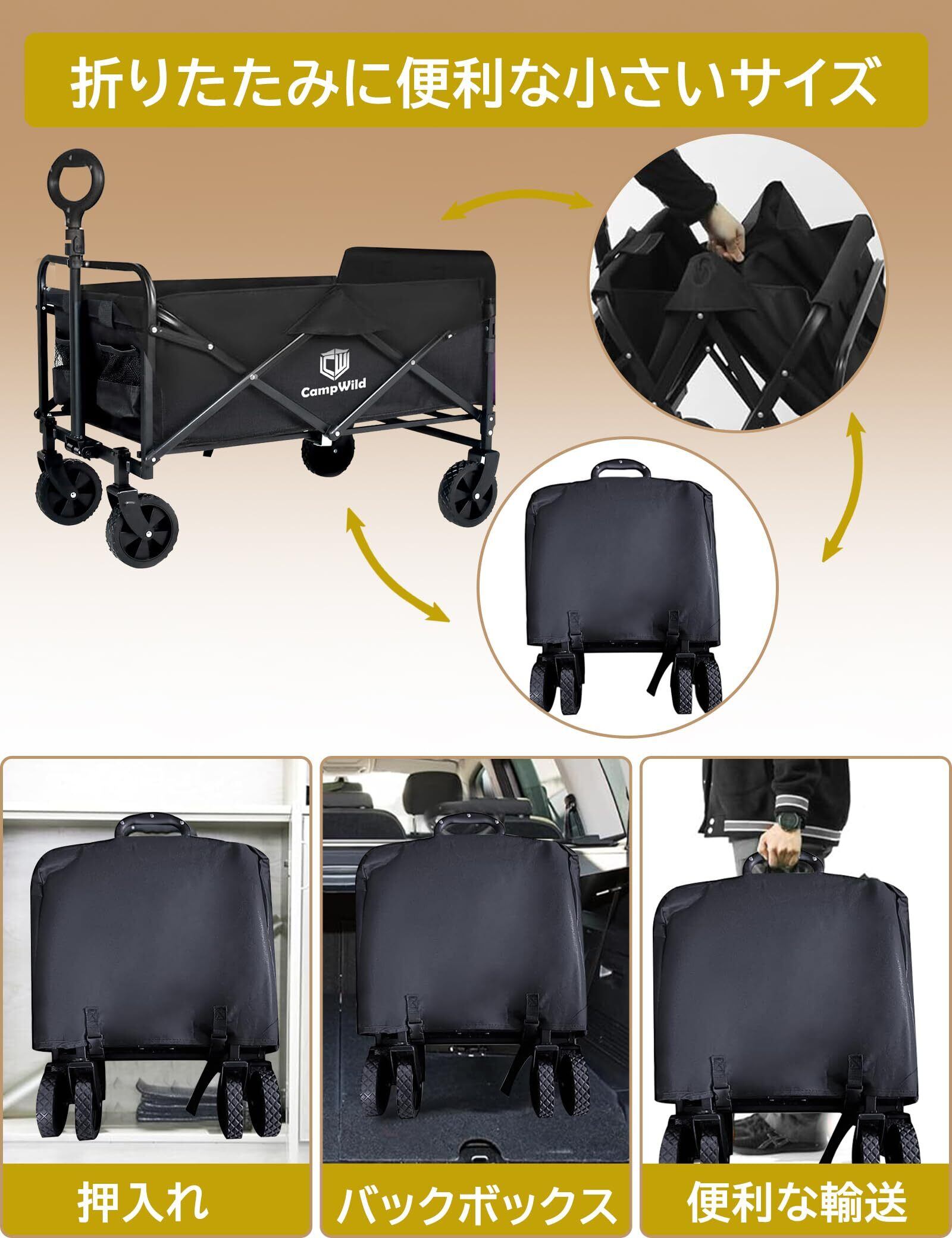 アウトドアワゴン 折りたたみ キャリーワゴン 自立収納式 後ろ開けキャンプワゴン 長物対応 容量が30%増加 耐荷重120kg コンパクト大容量 オックスフォードタープン アウトドア レジャー 買い物 釣り ビーチ パティオ BBQ (130L) (黒色)